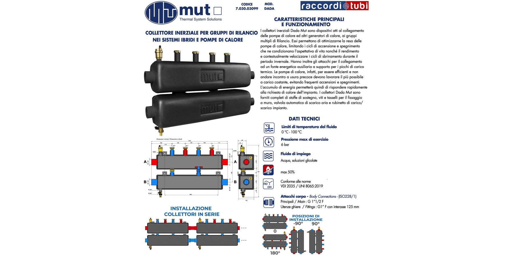 a carico costante, evitando frequenti accensioni e spegnimenti. L’accumulo di energia permetterà quindi di rispondere rapidamente alla richiesta di calore dell’impianto. I collettori Dada Mut sono forniti completi di staffe di sostegno, viti e tasselli per il fissaggioCollettore inerziale Dada Mut in acciaio verniciato e coibentato per impianti ibridi e pompe di calore, con attacchi principali da 1”1/2 femmina ed utenze con ghiere da 1”F e interassi 125mm.a muro, valvola automatica di scarico aria e rubinetto di carico/ scarico impianto