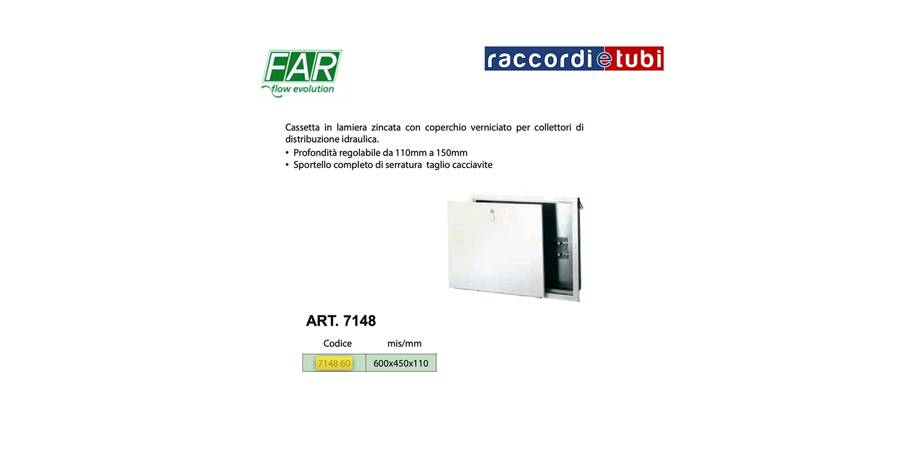 Cassetta in lamiera zincata con coperchio verniciato per collettori di distribuzione idraulica. • Profondità regolabile da 110 mm a 150 mm • Sportello completo di serratura taglio cacciavite