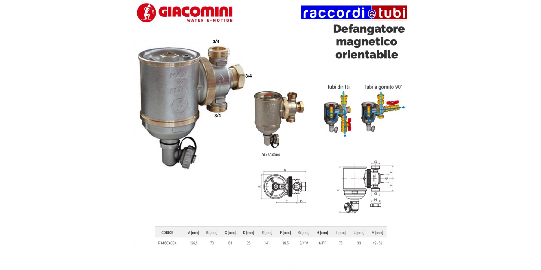 Corpo e portamagnete in ottone, inserto ciclonico in materiale sintetico ad alta resistenza, filtro 300 μm in acciaio inox AISI 304, guarnizioni in EPDM, magnete in neodimio.