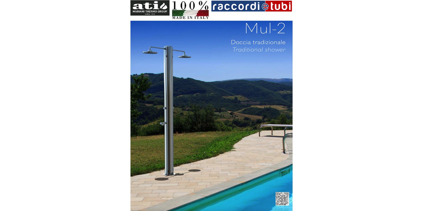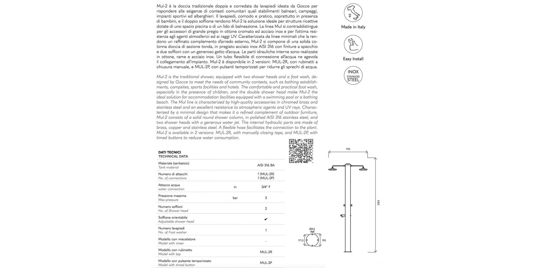 Mul-2 è la doccia tradizionale doppia e corredata da lavapiedi ideata da Gocce per rispondere alle esigenze di contesti comunitari quali stabilimenti balneari, campeggi, impianti sportivi ed alberghieri. Il lavapiedi, comodo e pratico, soprattutto in presenza di bambini, e il doppio soffione rendono Mul-2 la soluzione ideale per strutture ricettive dotate di uno spazio piscina o di un lido di balneazione. La linea Mul si contraddistingue per gli accessori di grande pregio in ottone cromato ed acciaio inox e per l’ottima resi- stenza agli agenti atmosferici ed ai raggi UV. Caratterizzata da linee minimali che la ren- dono un raffinato complemento d’arredo esterno, Mul-2 si compone di una solida co- lonna doccia di sezione tonda, in pregiato acciaio inox AISI 316 con finiture a specchio e due soffioni con un generoso getto d’acqua. Le parti idrauliche interne sono realizzate in ottone, rame e acciaio inox. Un tubo flessibile di connessione all’acqua ne agevola il collegamento all’impianto. Mul-2 è disponibile in 2 versioni: MUL-2R, con rubinetti a chiusura manuale, e MUL-2P, con pulsanti temporizzati per ridurre gli sprechi di acqua.