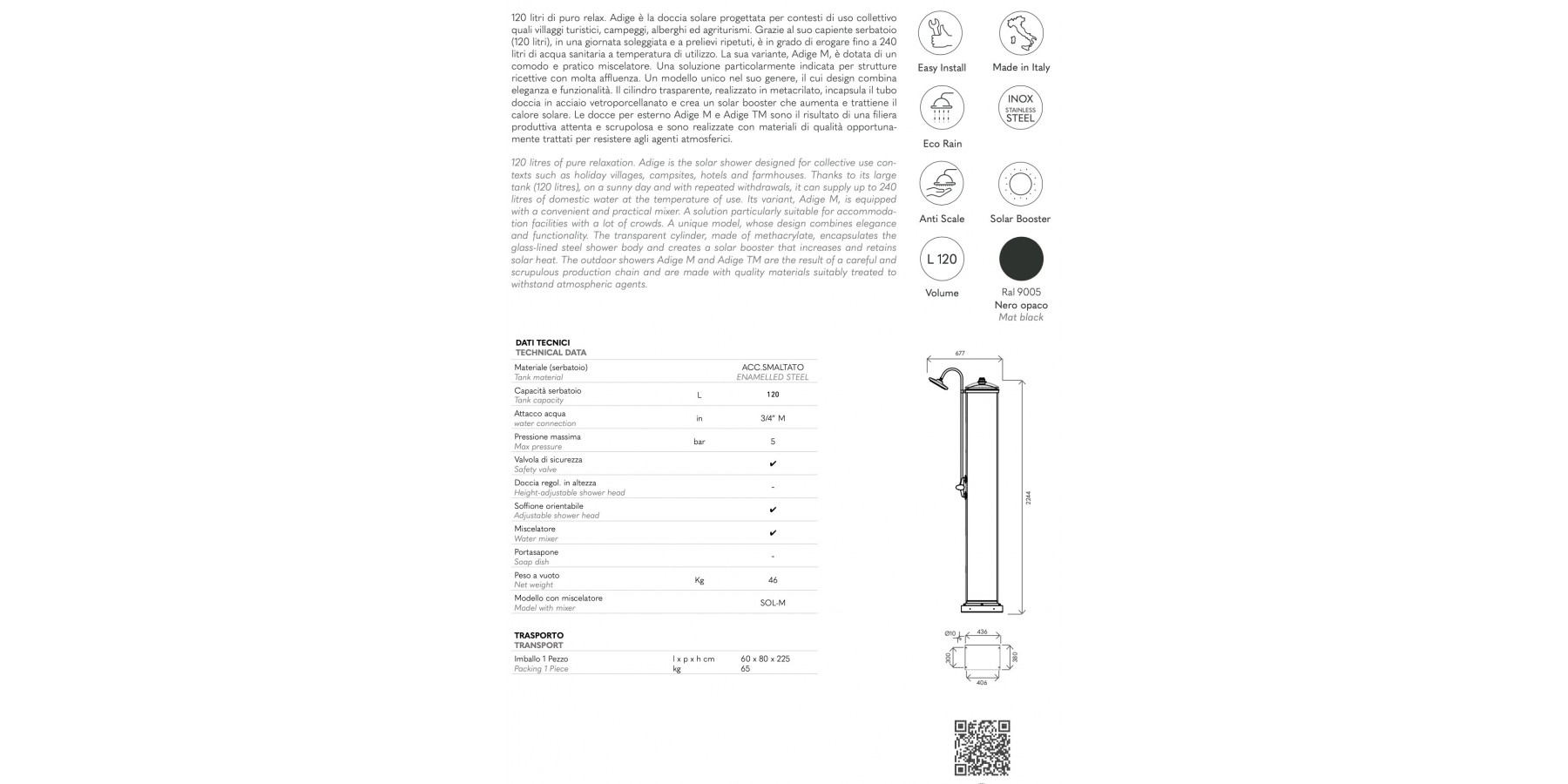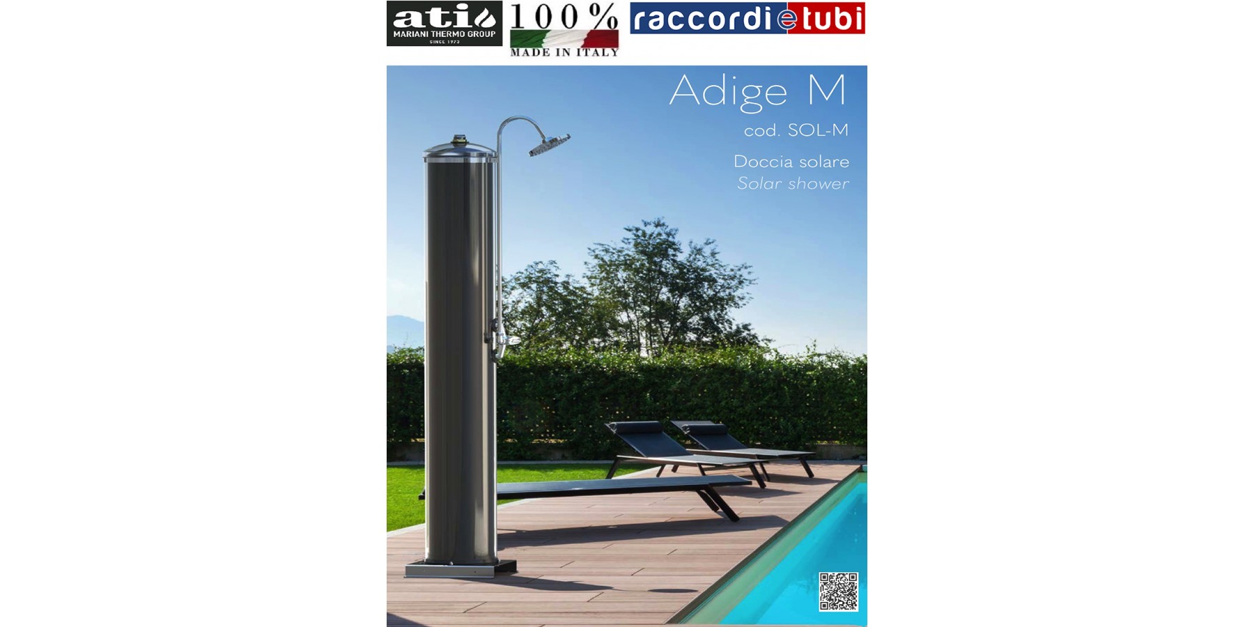 120 litri di puro relax. Adige è la doccia solare progettata per contesti di uso collettivo quali villaggi turistici, campeggi, alberghi ed agriturismi. Grazie al suo capiente serbatoio (120 litri), in una giornata soleggiata e a prelievi ripetuti, è in grado di erogare fino a 240 litri di acqua sanitaria a temperatura di utilizzo. La sua variante, Adige M, è dotata di un comodo e pratico miscelatore. Una soluzione particolarmente indicata per strutture ricettive con molta affluenza. Un modello unico nel suo genere, il cui design combina eleganza e funzionalità. Il cilindro trasparente, realizzato in metacrilato, incapsula il tubo doccia in acciaio vetroporcellanato e crea un solar booster che aumenta e trattiene il calore solare. Le docce per esterno Adige M e Adige TM sono il risultato di una filiera produttiva attenta e scrupolosa e sono realizzate con materiali di qualità opportuna- mente trattati per resistere agli agenti atmosferici