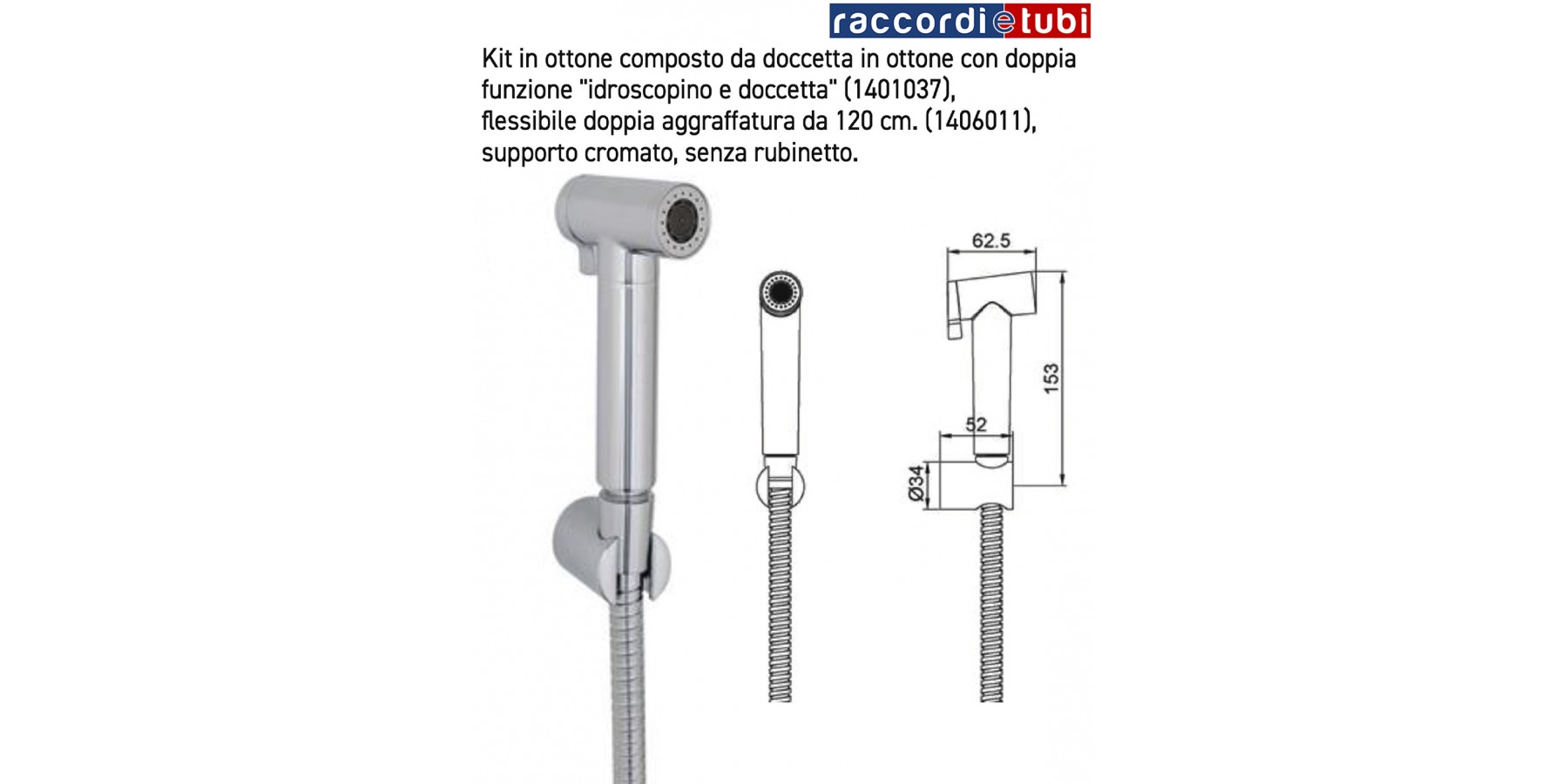 Kit in ottone composto da doccetta in ottone con doppia funzione "idroscopino e doccetta" (1401037),flessibile doppia aggraffatura da 120 cm. (1406011), supporto cromato, senza rubinetto.