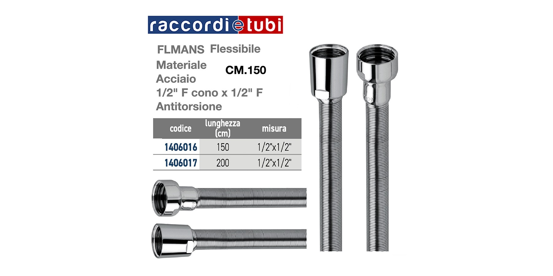 FLESSIBILE DOCCIA CM.150 IN ACCIAIO INOX ANTITORSIONE D.1/2''x1/2'' 1406016