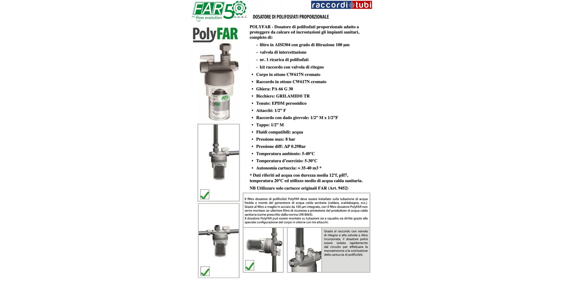 POLYFAR - Dosatore di polifosfati proporzionale adatto a proteggere da calcare ed incrostazioni gli impianti sanitari, completo di: