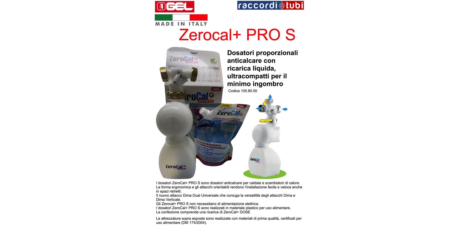 Caratteristiche I dosatori ZeroCal PRO S sono dosatori anticalcare per caldaie e scambiatori di calore. La forma ergonomica e gli attacchi orientabili rendono l’installazione facile e veloce anche in spazi ristretti. Ai tradizionali attacchi Dima, si aggiunge il nuovo attacco Dima Dual Universale che coniuga la versatilità degli attacchi Dima e Dima Verticale. Gli Zerocal PRO S non necessitano di alimentazione elettrica. I dosatori ZeroCal PRO S sono realizzati in materiale plastico per uso alimentare. La confezione comprende una ricarica di ZeroCal DOSE. Le attrezzature sopra esposte sono realizzate con materiali di prima qualità, certificati per uso alimentare (DM 174/2004).