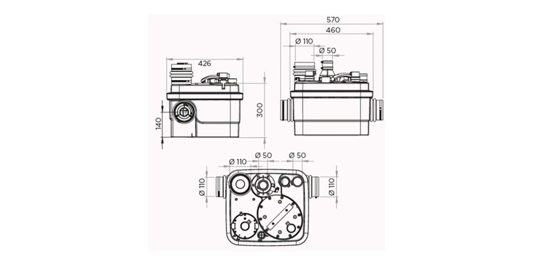 Stazione di sollevamento per acque chiare e scure con una testata trituratrice, progettata per uso singolo (villetta, piccolo locale commerciale). Potenza motore 1.500 W. Temperatura max delle acque refl ue: 70°C ad intermittenza (max 5 min.) A corredo: valvola clapet integrata, allarme remoto via cavo. Applicazioni: lavabo - bidet - wc - vasca da bagno - doccia - lavatrice - lavello - lavastoviglie - degrassatore Capacità di scarico: 11 metri in verticale (tubo Ø 50 mm.) 110 metri in orizzontale (tubo Ø 50 mm.