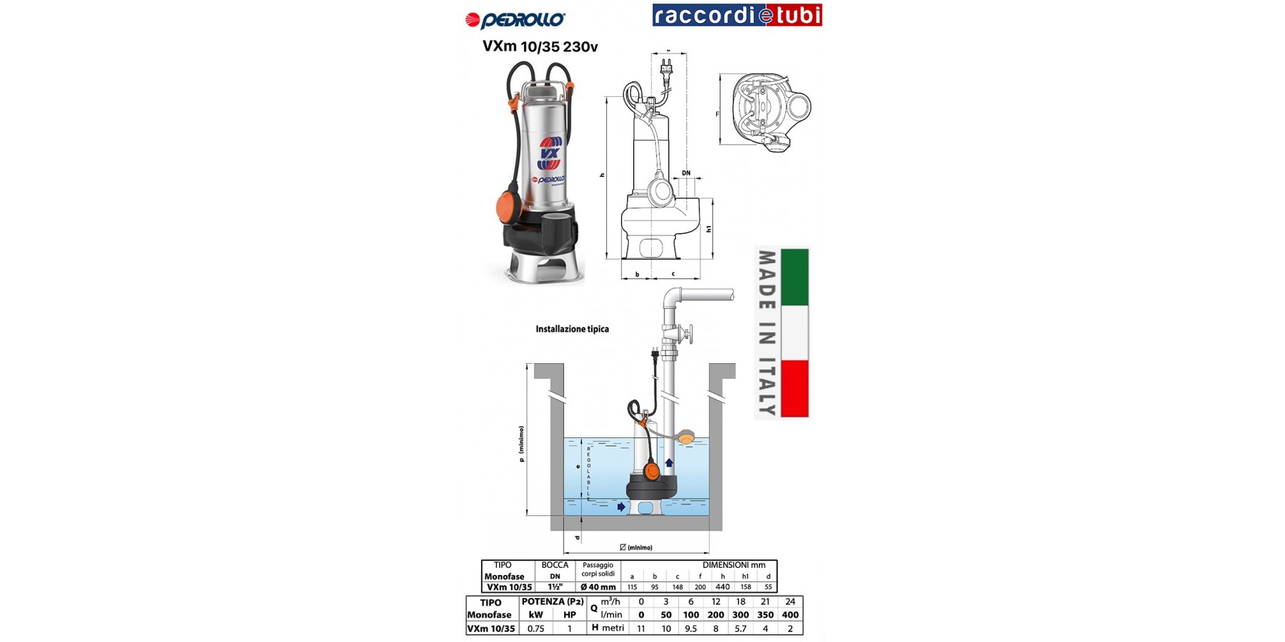 ELETTROPOMPA PEDROLLO SOMMERGIBILE PER ACQUE LURIDE "VORTEX" MONOFASE VXM10/35