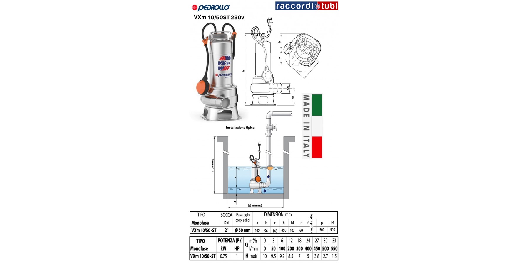 ELETTROPOMPA PEDROLLO SOMMERGIBILE PER ACQUE LURIDE "VORTEX" MONOFASE VXM10/35