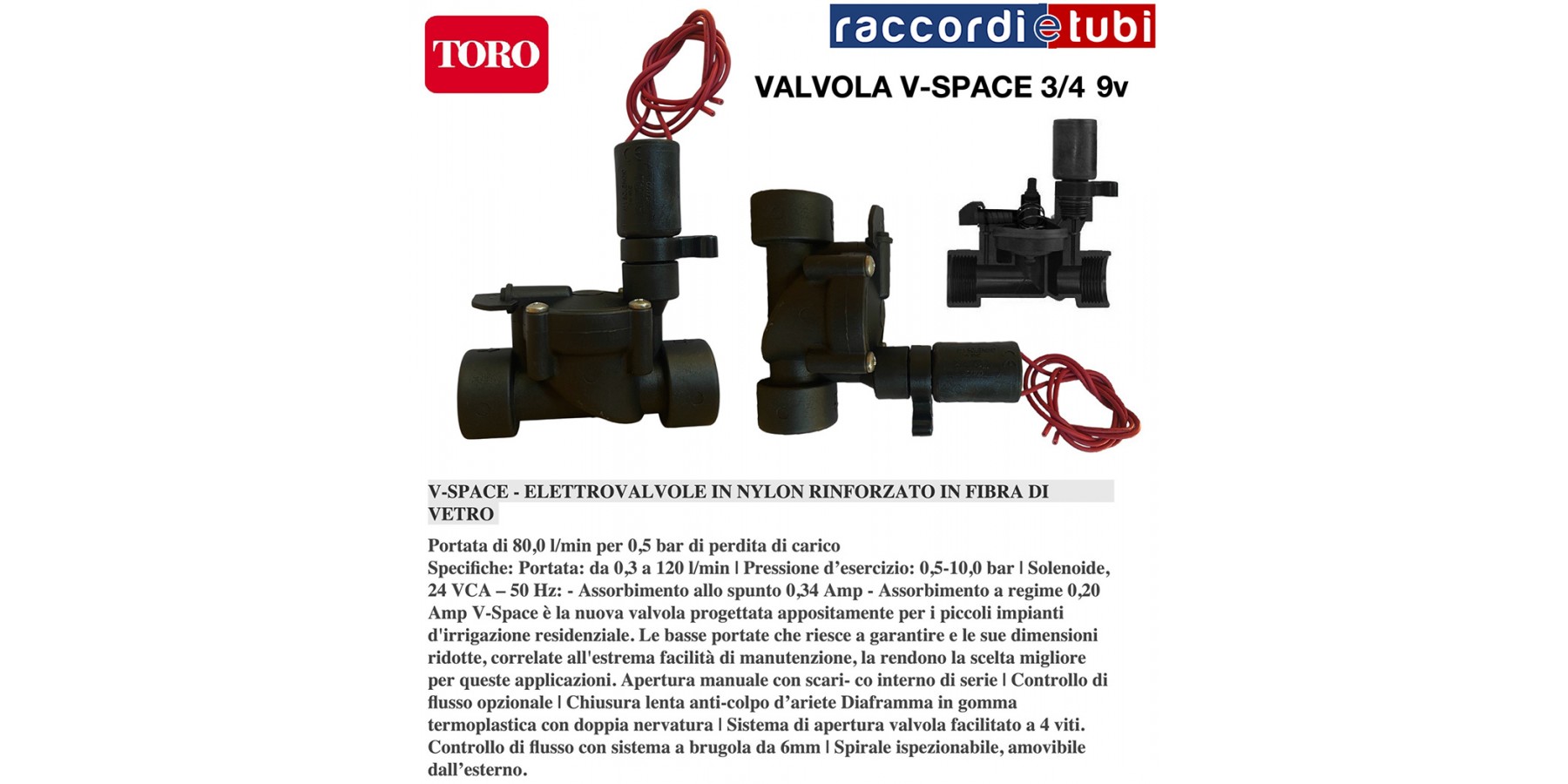 La V-Space è la nuova valvola Toro progettata appositamente per i piccoli impianti d’irrigazione residenziale. Le basse portate che riesce a garantire e le sue dimensioni ridotte, correlate all’estrema facilità di manutenzione, la rendono la scelta migliore per queste applicazioni.