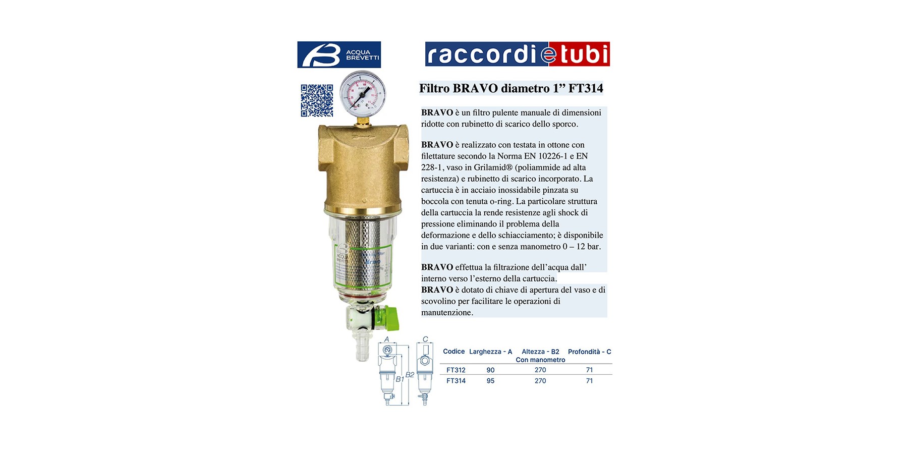 BRAVO è un filtro pulente manuale di dimensioni ridotte con rubinetto di scarico dello sporco. BRAVO è realizzato con testata in ottone con filettature secondo la Norma EN 10226-1 e EN 228-1, vaso in Grilamid® (poliammide ad alta resistenza) e rubinetto di scarico incorporato. La cartuccia è in acciaio inossidabile pinzata su boccola con tenuta o-ring. La particolare struttura della cartuccia la rende resistente agli shock di pressione eliminando il problema della deformazione e dello schiacciamento; è disponibile in due varianti: con e senza manometro 0 - 12 bar. BRAVO effettua la filtrazione dell’acqua dall’ interno verso l’esterno della cartuccia. BRAVO è dotato di chiave di apertura del vaso e di scovolino per facilitare le operazioni di manutenzione. Per la manutenzione e gli interventi di sanificazione è possibile rivolgersi ai Centri Assistenza Autorizza.