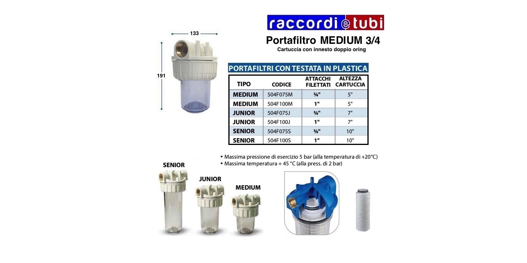 I FILTRI PER ACQUA A 3 PEZZI SONO PROGETTATI PER CARTUCCE AD INNESTO RAPIDO CON DOPPIO O-RING 45 MM (SOE – O-RING 222).