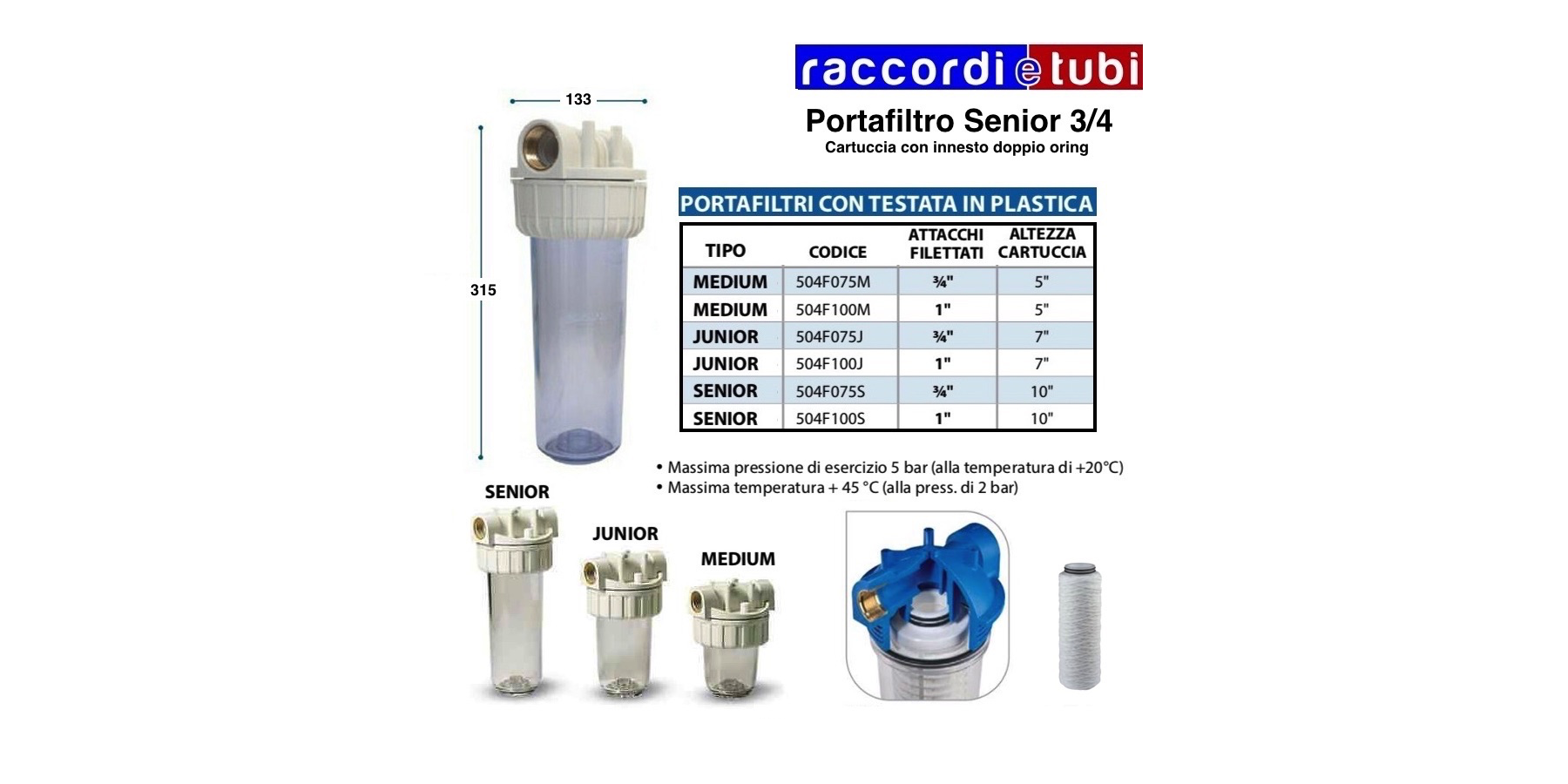 I FILTRI PER ACQUA A 3 PEZZI SONO PROGETTATI PER CARTUCCE AD INNESTO RAPIDO CON DOPPIO O-RING 45 MM (SOE – O-RING 222).