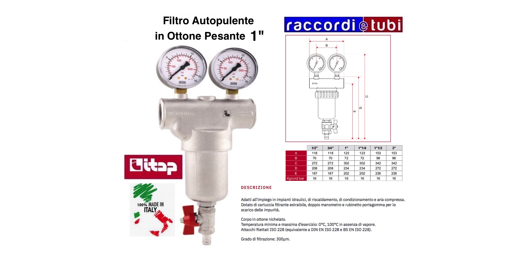 Dotato di cartuccia filtrante estraibile, doppio manometro e rubinetto portagomma per lo scarico delle impurità.