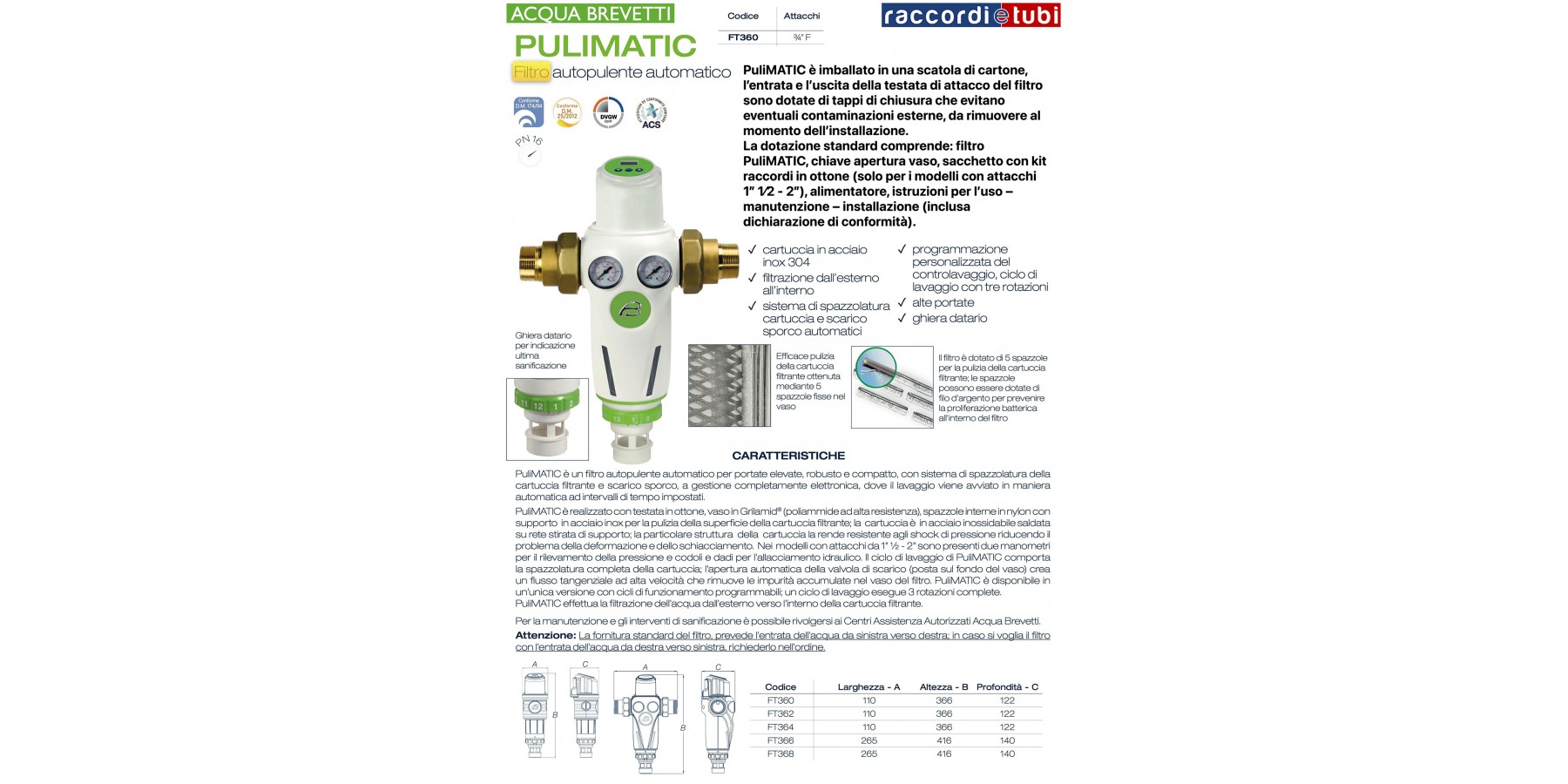 Grazie al suo sistema brevettato di spazzolatura e scarico garantisce, oltre allo scarico delle impurità in sospensione nell’acqua, una efficace e reale pulizia anche della cartuccia filtrante. A seconda delle applicazioni, a valle del filtro è consigliabile l’installazione di un’elettrovalvola (esclusa dalla fornitura e gestibile dal contatto elettrico disponibile sul filtro stesso) che interrompa il flusso d’acqua agli utilizzi durante le operazioni di lavaggio.