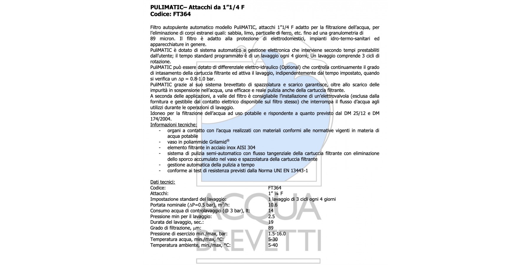 Filtro autopulente PuliMATIC adatto alla filtrazione dell'acqua per l'eliminazione di corpi estranei quali: piccole quantità di sabbia, scaglie di ossidi, materiale grossolano, ecc. fino ad una granulometria di 100 micron. Il filtro è adatto per la protezione di impianti idrotermosanitari, elettrodomestici e apparecchiature in genere. PuliMATIC è dotato di sistema automatico a gestione elettronica che interviene secondo tempi prestabiliti dall’utente.