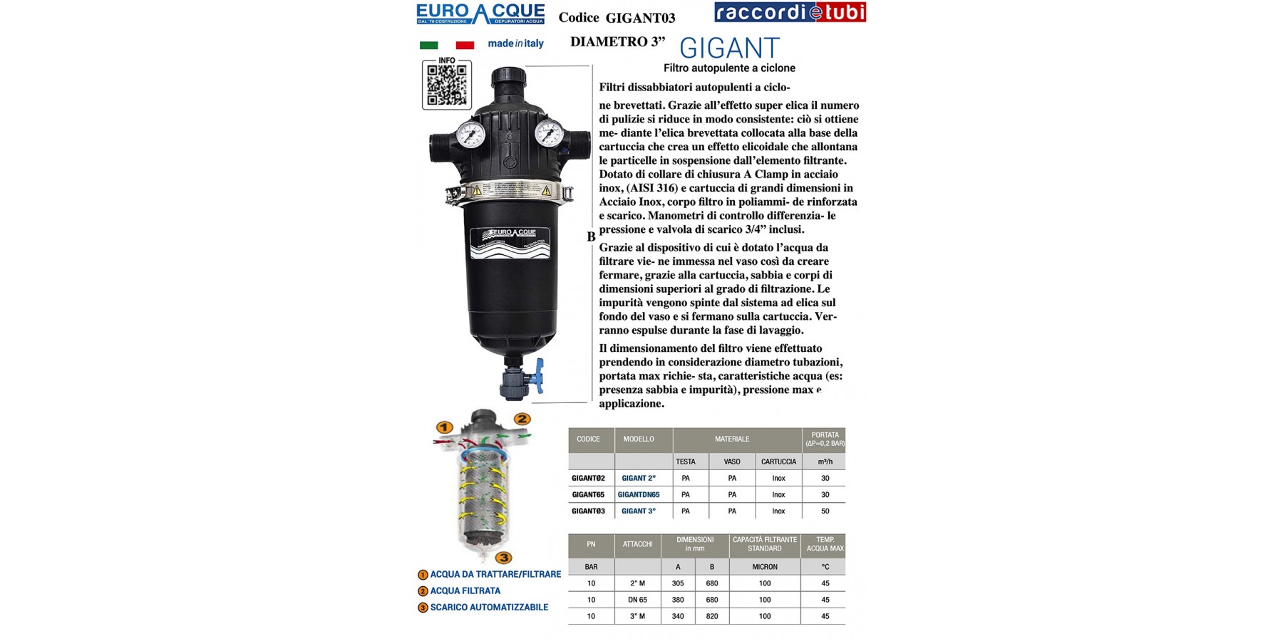Il filtro Euroacque autopulente ad elica brevettato. Per lavare il filtro e sufficiente aprire lo scarico del filtro per azionare il sistema autopulente ad elica. La pulizia dell’elemento filtrante si ottiene mediante un’elica brevettata collocata alla base della cartuccia (in acciaio inox), risultato di un attento studio di disegno e meccanica idraulica. Le sue alette deflettrici creano all’acqua che entra nel filtro un effetto elicoidale, che sposta le particelle in sospensione contro le pareti del coperchio, mantenendole lontane dall’elemento filtrante e riducendo in tal modo al minimo la frequenza delle pulizie. Il corpo del filtro è realizzato in poliammide rinforzata. Gigant è dotato di un pratico collare di chiusura realizzato in acciaio inox AISI 316 e le guarnizioni per la perfetta tenuta idraulica sono in NBR. Il filtro è dotato di n° 2 manometri di controllo, scarico di fondo per facile eliminazione delle impurità raccolte e tappo speciale per installazione orizzontale o a squadra