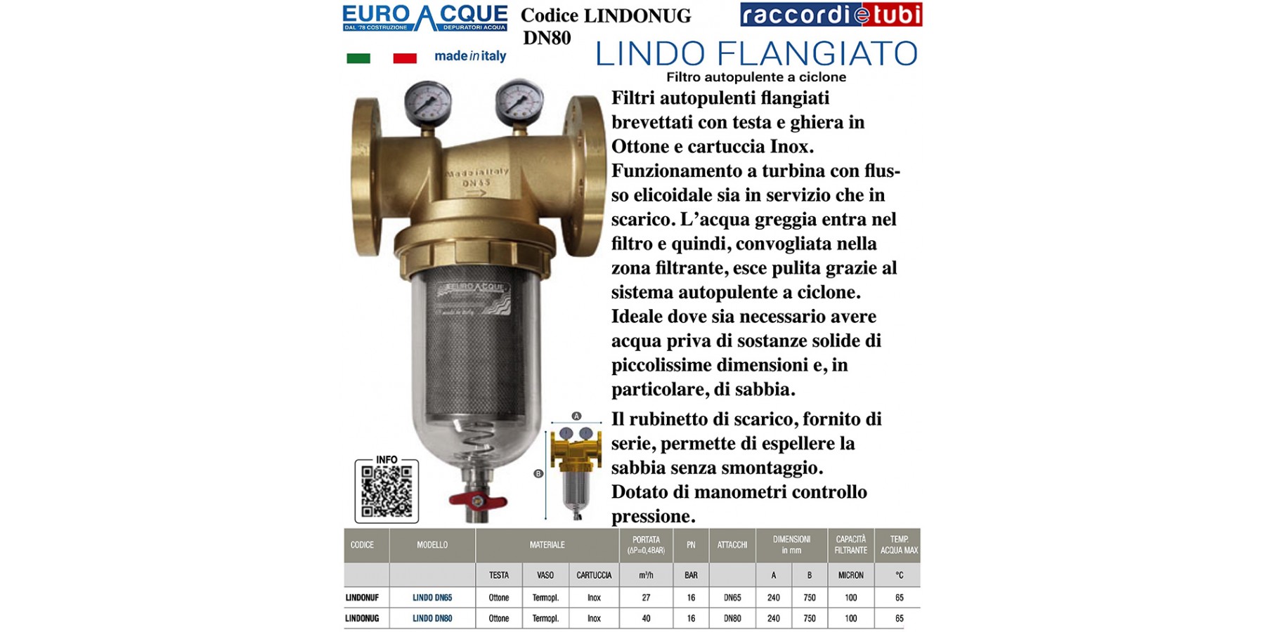 I filtri autopulenti flangiati brevettati con testa e ghiera in ottone e cartuccia inox. Funzionamento a turbina con flusso elicoidale sia in servizio che in scarico. L’acqua greggia entra nel filtro e quindi, convogliata nella zona filtrante, esce pulita grazie al sistema autopulente a ciclone. Ideale dove sia necessario avere acqua priva di sostanze solide di piccolissime dimensioni e, in particolare, di sabbia. Il rubinetto di scarico, fornito di serie, permette di espellere la sabbia senza smontaggio. Dotato di manometri controllo pressione