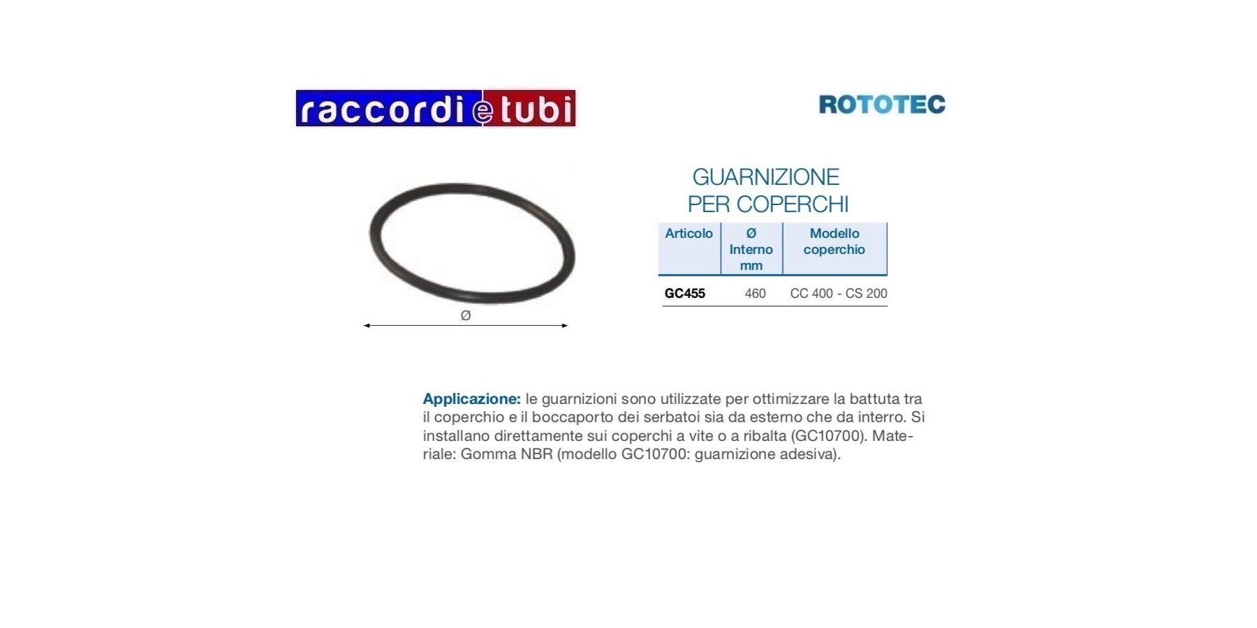 Applicazione: le guarnizioni sono utilizzate per ottimizzare la battuta tra il coperchio e il boccaporto dei serbatoi sia da esterno che da interro. Si installano direttamente sui coperchi a vite o a ribalta (GC10700). Materiale: Gomma NBR (modello GC10700: guarnizione adesiva).