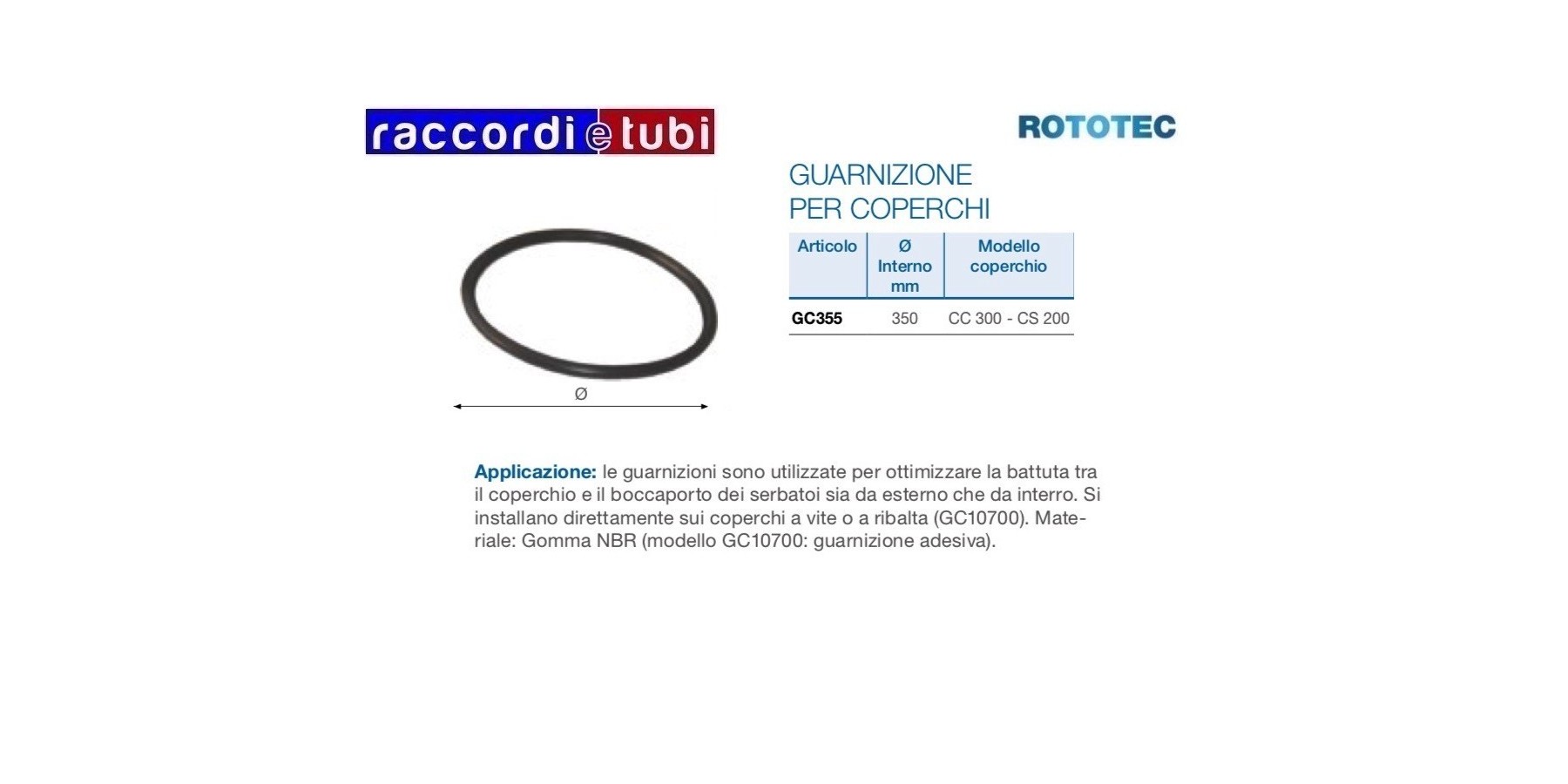 Applicazione: le guarnizioni sono utilizzate per ottimizzare la battuta tra il coperchio e il boccaporto dei serbatoi sia da esterno che da interro. Si installano direttamente sui coperchi a vite o a ribalta (GC10700). Materiale: Gomma NBR (modello GC10700: guarnizione adesiva).