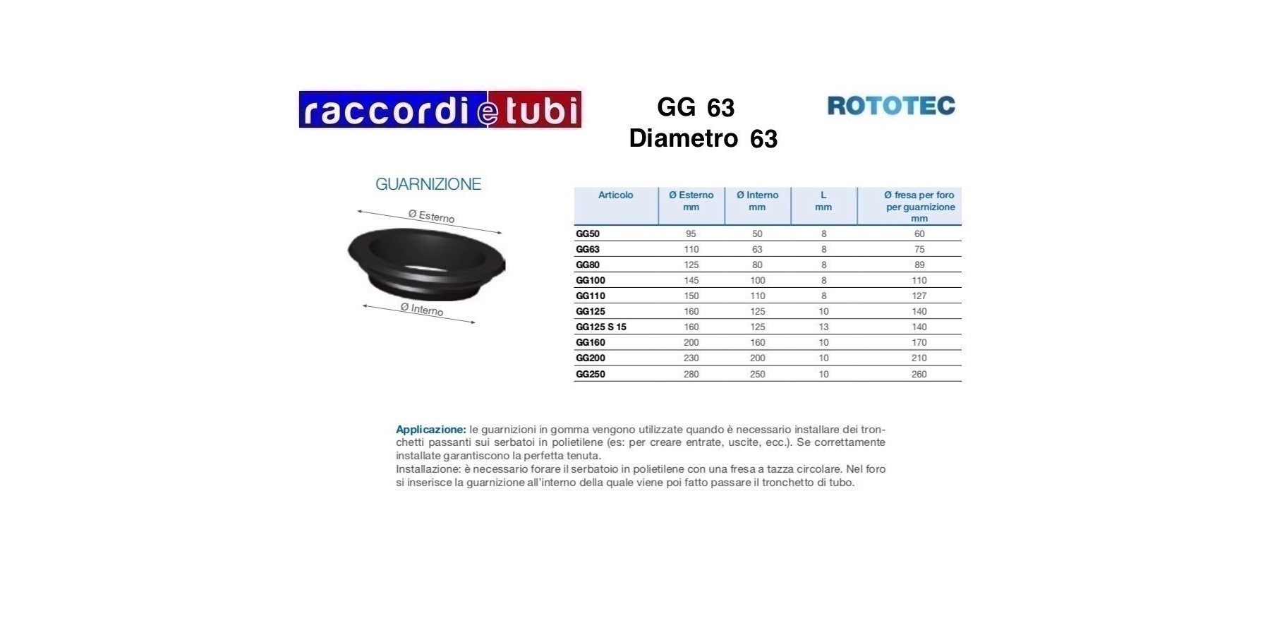 Applicazione: le guarnizioni in gomma vengono utilizzate quando è necessario installare dei tronchetti passanti sui serbatoi in polietilene (es: per creare entrate, uscite, ecc.). Se correttamente installate garantiscono la perfetta tenuta. Installazione: è necessario forare il serbatoio in polietilene con una fresa a tazza circolare. Nel foro si inserisce la guarnizione all’interno della quale viene poi fatto passare il tronchetto di tubo.