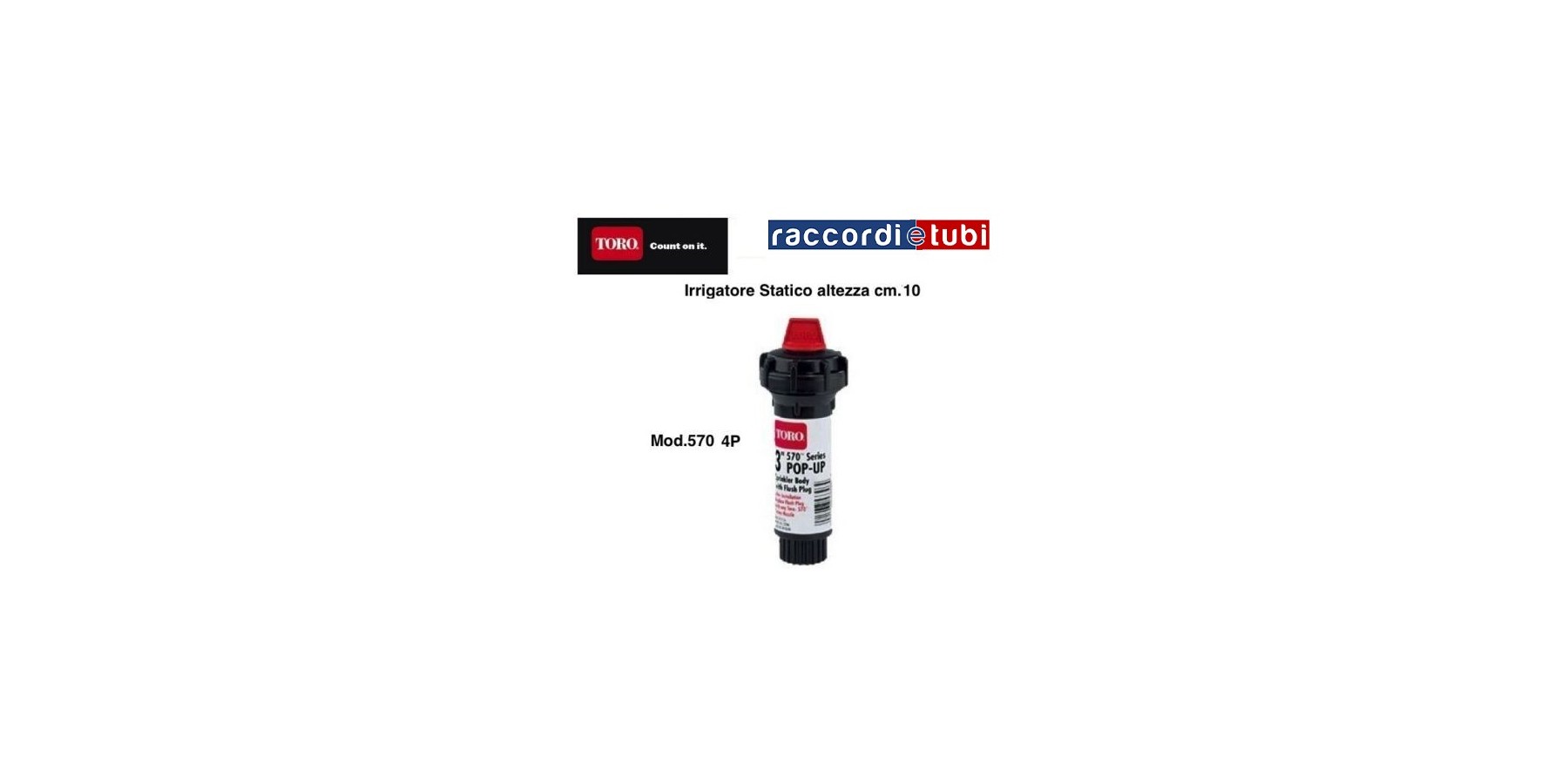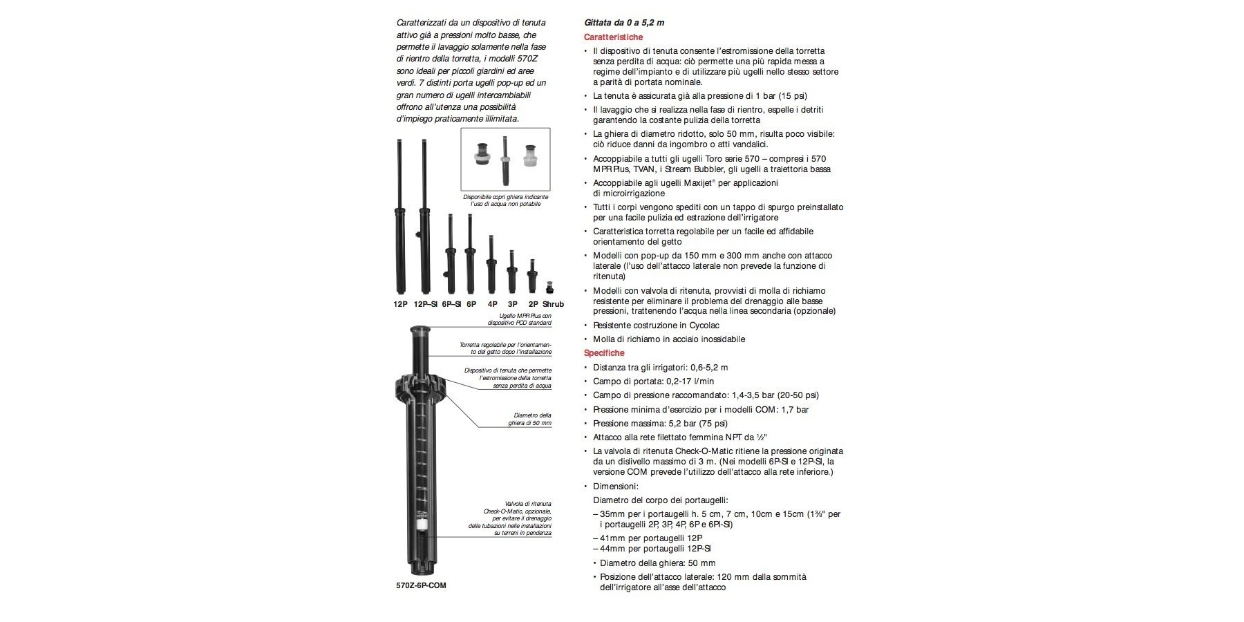 Gli irrigatori statici Toro 570 sono caratterizzati da un dispositivo di tenuta attivo già a pressioni molto basse, che permette il lavaggio solamente nella fase di rientro della torretta, sono ideali per piccoli giardini ed aree verdi.