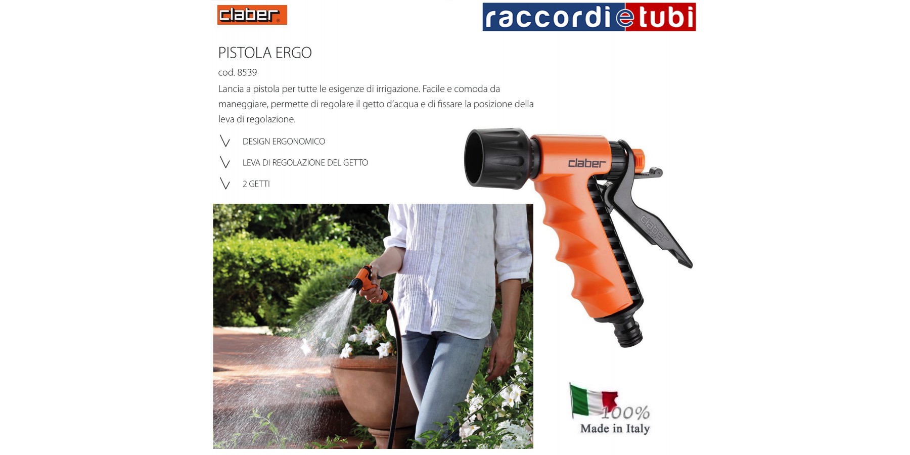 Lancia a pistola con comoda impugnatura ergonomica. Leva di regolazione del flusso d’acqua. Doppio getto: da tutto chiuso a tutto aperto (concentrato o nebulizzato). Dispositivo di selezione e blocco del getto desiderato