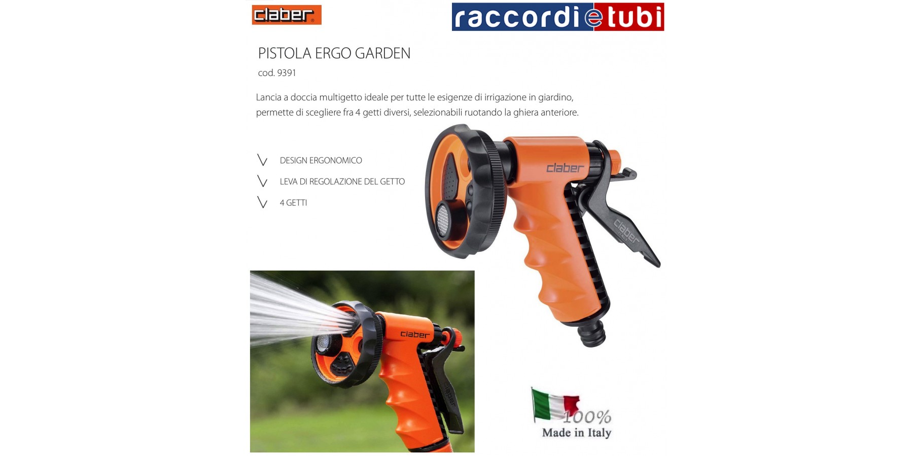 Lancia a pistola multigetto con comoda impugnatura ergonomica. Ruotando la testa della pistola si ottengono getti diversi: da diffuso a concentrato, annaffiatoio, doccia e aeratore (il getto d’acqua è miscelato con piccole perle d’aria). Quest’ultimo è utilissimo per bagnare le piante in vaso senza sollevare schizzi d’acqua. Dispositivo di selezione e blocco del getto desiderato.