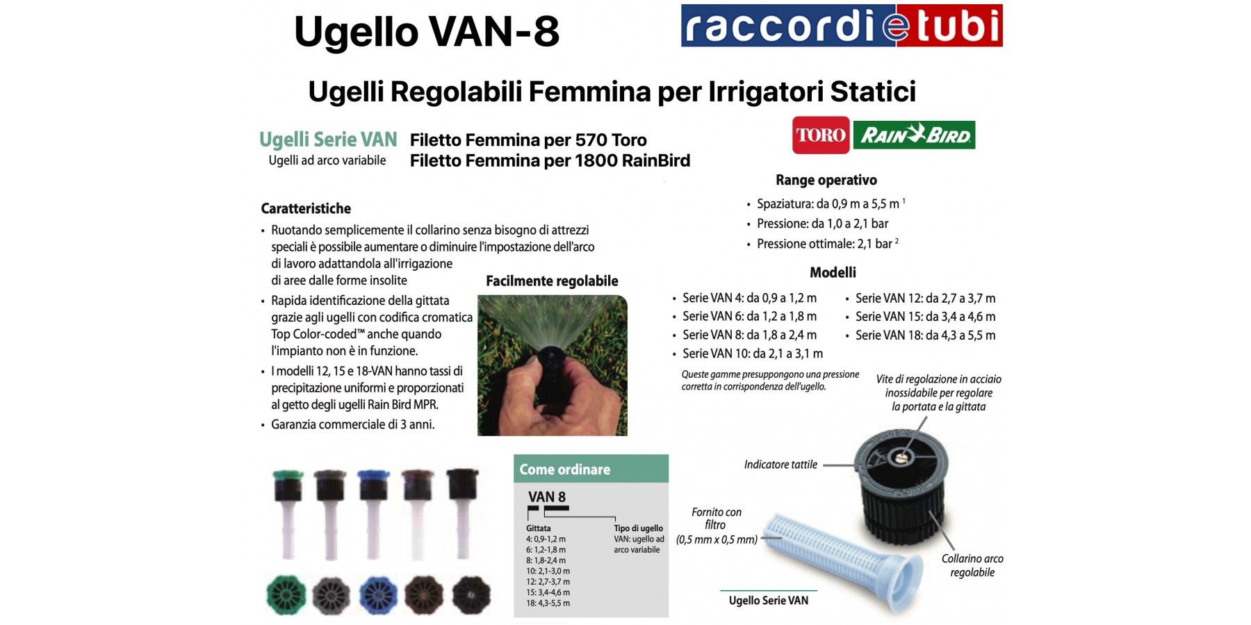 Gli ugelli VAN offrono una copertura uniforme su tutto lo schema di irrigazione, per un'area verde sempre sana e bella. L'irrigazione leggera vicino all'irrigatore elimina le zone secche intorno all'irrigatore stesso. Gli ugelli VAN producono gocce di grandi dimensioni resistenti al vento che impediscono l'atomizzazione e l'evaporazione, distribuendo così la giusta quantità di acqua nell'area desiderata