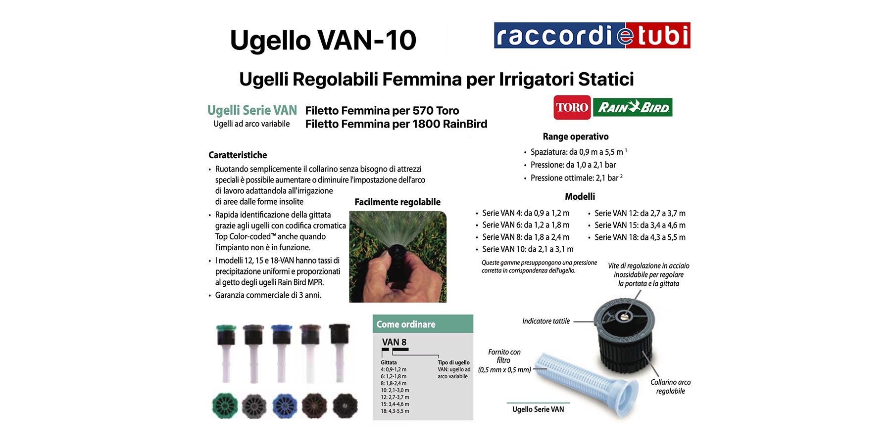 Gli ugelli VAN offrono una copertura uniforme su tutto lo schema di irrigazione, per un'area verde sempre sana e bella. L'irrigazione leggera vicino all'irrigatore elimina le zone secche intorno all'irrigatore stesso. Gli ugelli VAN producono gocce di grandi dimensioni resistenti al vento che impediscono l'atomizzazione e l'evaporazione, distribuendo così la giusta quantità di acqua nell'area desiderata