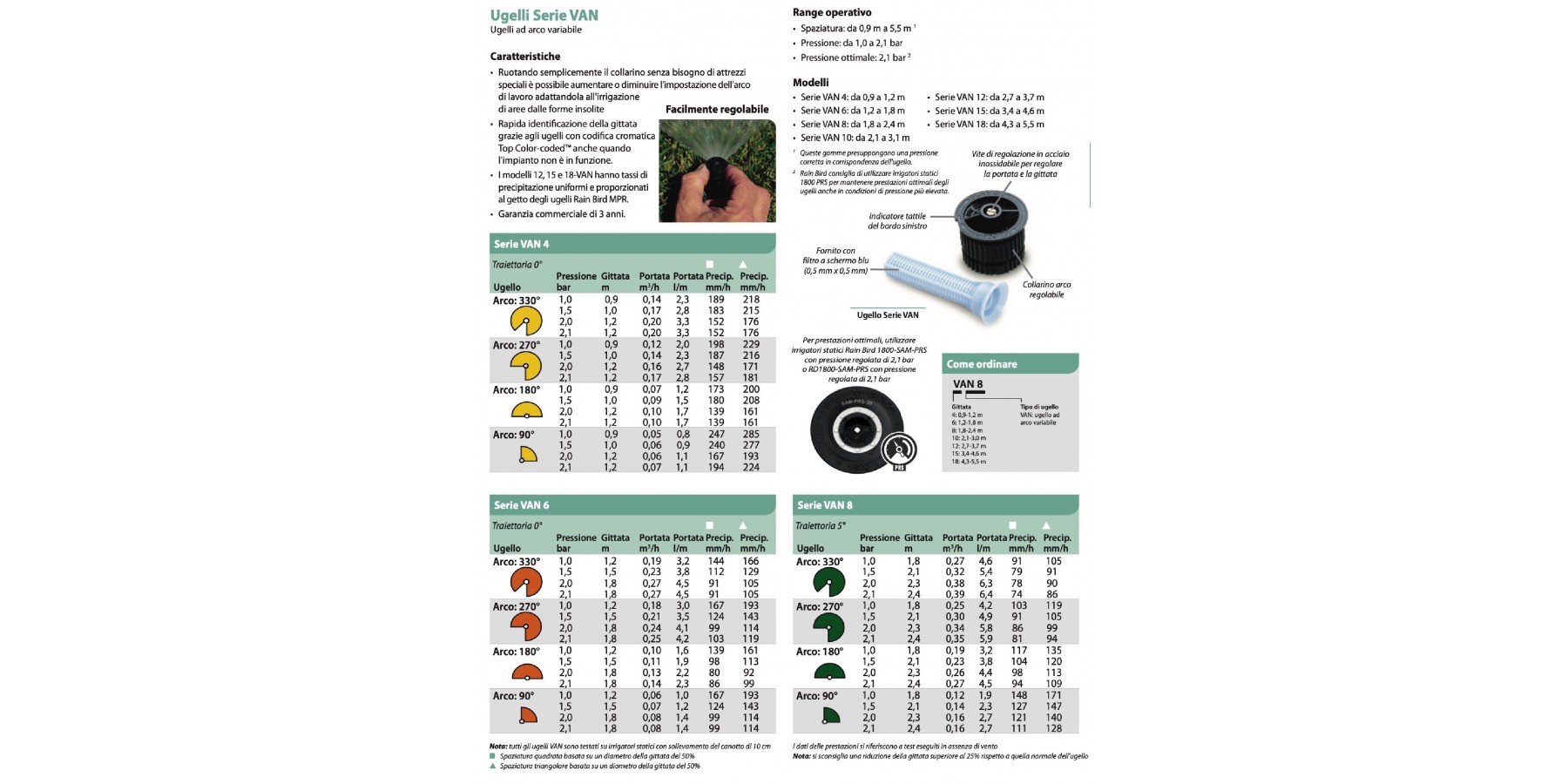 Gli ugelli VAN offrono una copertura uniforme su tutto lo schema di irrigazione, per un'area verde sempre sana e bella. L'irrigazione leggera vicino all'irrigatore elimina le zone secche intorno all'irrigatore stesso. Gli ugelli VAN producono gocce di grandi dimensioni resistenti al vento che impediscono l'atomizzazione e l'evaporazione, distribuendo così la giusta quantità di acqua nell'area desiderata.