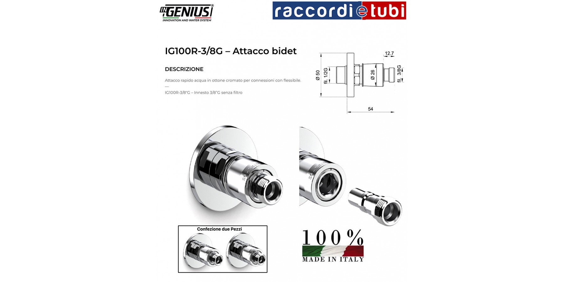 Attacco rapido acqua in ottone cromato per connessioni con flessibile.—IG100R-3/8″G 45° – Innesto 3/8”G con sicurvetta 45° senza filtro