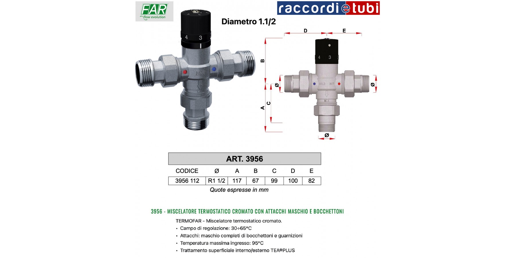 TERMOFAR - Miscelatore termostatico per impianti sanitari. • Campo di regolazione: 30÷65°C • Attacchi: maschio completi di bocchettoni e guarnizioni • Temperatura massima ingresso: 95°C • Trattamento superficiale interno/esterno TEA®PLUS