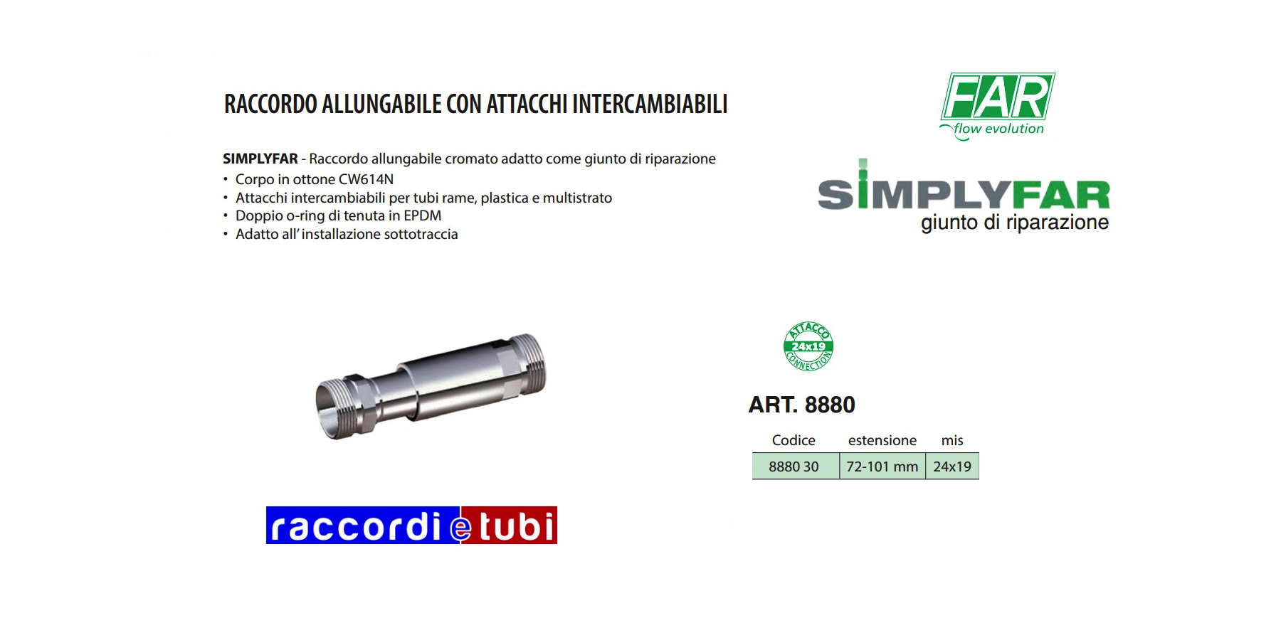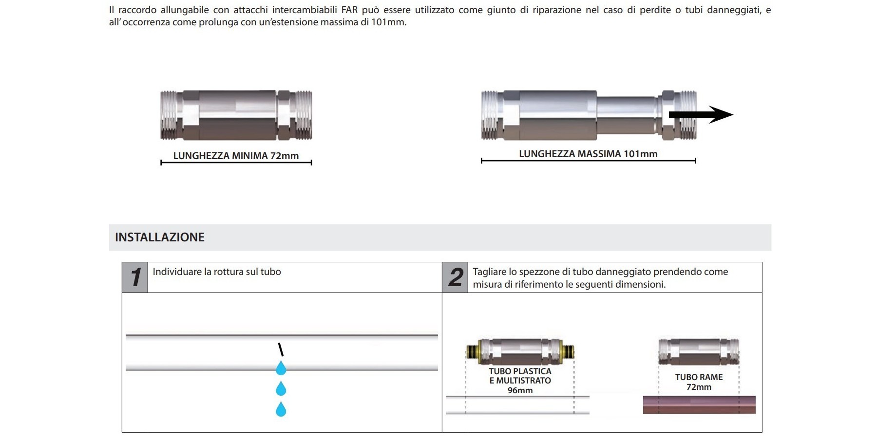 Il raccordo allungabile con attacchi intercambiabili FAR può essere utilizzato come giunto di riparazione nel caso di perdite o tubi danneggiati, e all’ occorrenza come prolunga con un’estensione massima di 101mm.