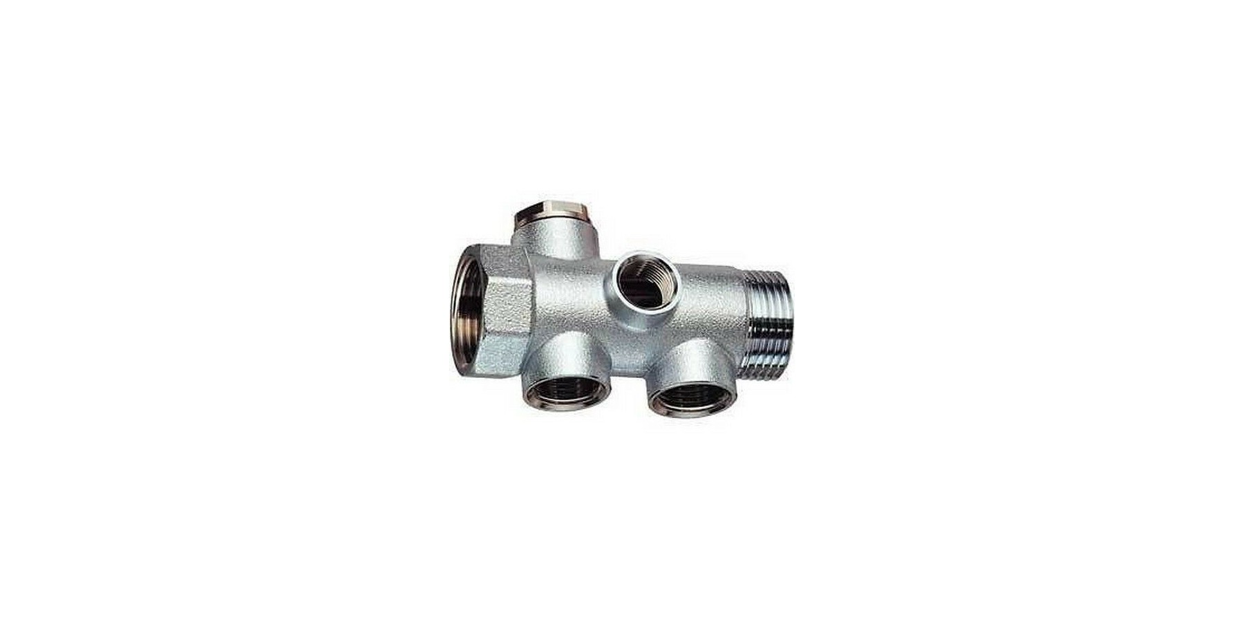 Raccordo intermedio cromato per collettori predisposto per attacco valvola sfogo aria, termometro e rubinetto di scarico. • Misura: 1” maschio-femmina