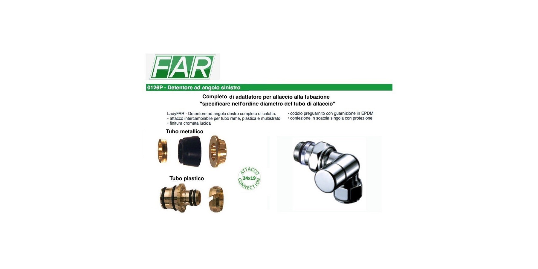 Detentore cromato LadyFAR finitura cromata lucida, ad angolo destro, per radiatori con attacco da 3/8” e 1/2” per tubo rame plastica e multistrato, codolo con guarnizione in EPDM, tenuta tra codolo e corpo valvola in HPF, doppio o-ring di tenuta sull’asta, otturatore a battuta metallica e cappuccio in ottone cromato e completo di calotta cromata lucida. Temperatura max d’esercizio 95°C. Pressione max d’esercizio 10 bar.
