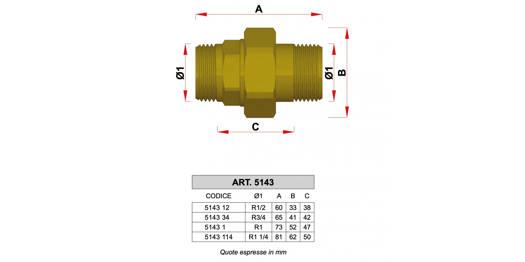 5143 - RACCORDO 3 PEZZI DIRITTO IN OTTONE GIALLO, ATTACCHI MASCHIO