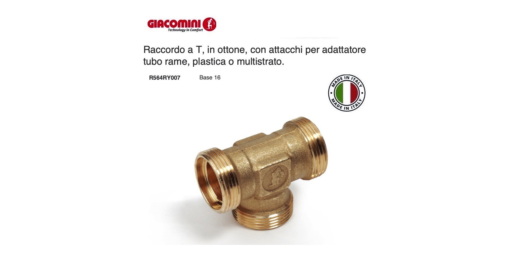Raccordo,INTERMEDIO A TE, in ottone, con attacco per adattatore tubo rame, plastica o multistrato.