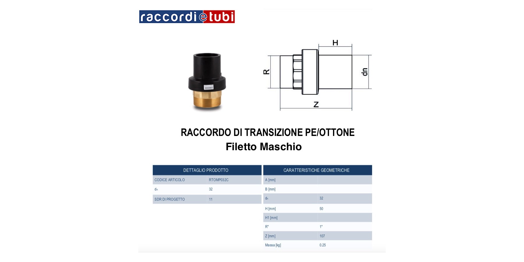 Principali caratteristiche: famiglia dei raccordi di transizione; PE100 nero e ottone; SDR 11; esecuzione stampata.