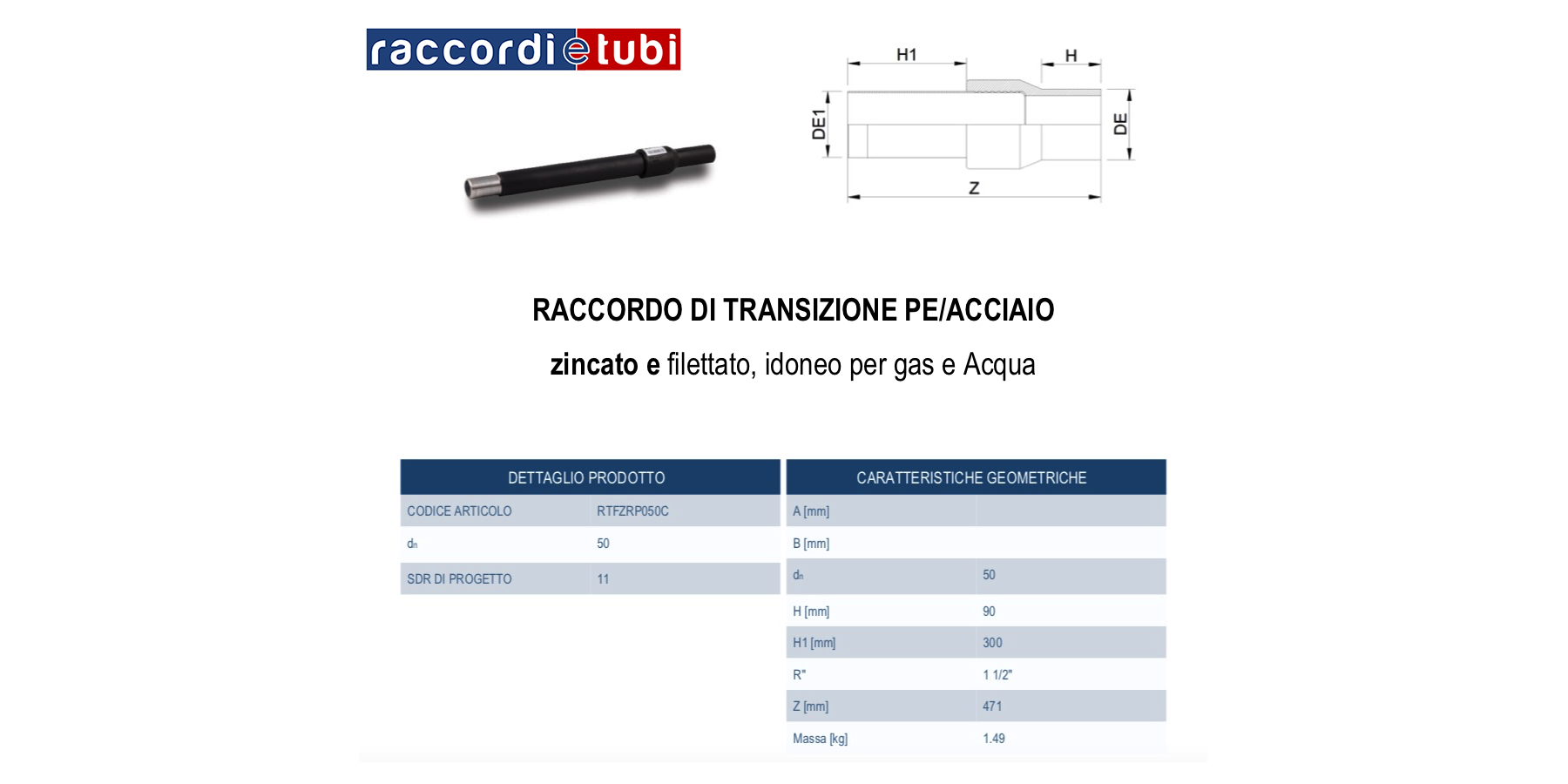 Principali caratteristiche: categoria dei raccordi di transizione; PE100 nero e acciaio; SDR 11; acciaio rivestito in polietilene e zincato; filettato; esecuzione stampata.
