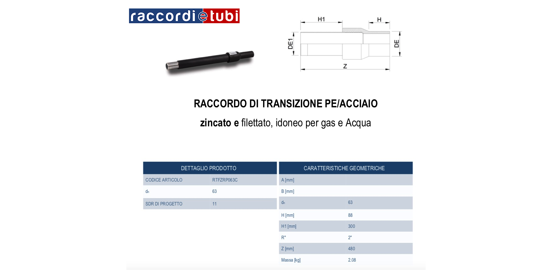 Principali caratteristiche: categoria dei raccordi di transizione; PE100 nero e acciaio; SDR 11; acciaio rivestito in polietilene e zincato; filettato; esecuzione stampata.
