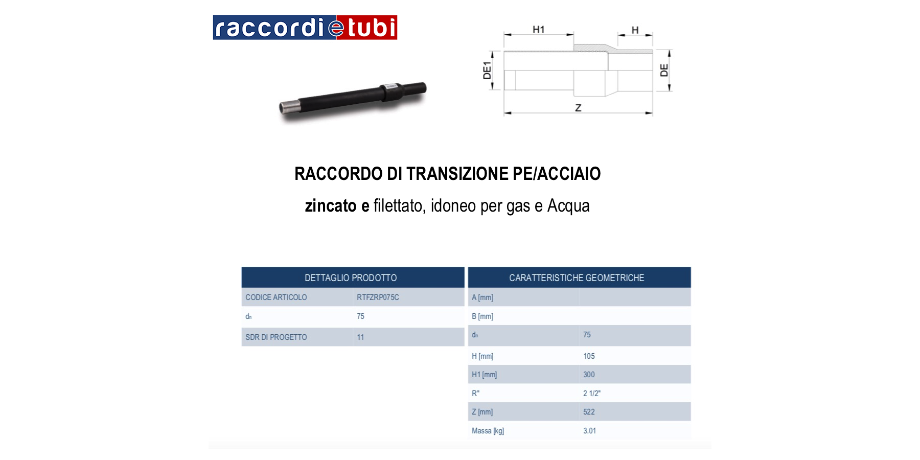 Principali caratteristiche: categoria dei raccordi di transizione; PE100 nero e acciaio; SDR 11; acciaio rivestito in polietilene e zincato; filettato; esecuzione stampata.