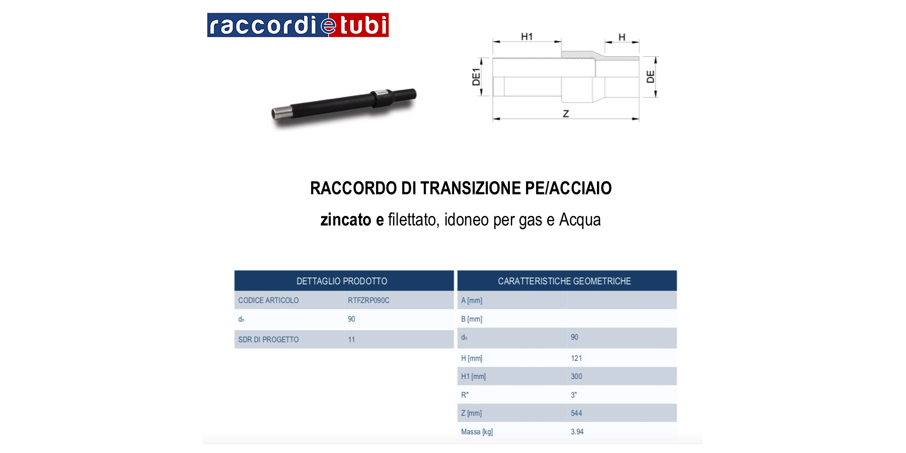 Principali caratteristiche: categoria dei raccordi di transizione; PE100 nero e acciaio; SDR 11; acciaio rivestito in polietilene e zincato; filettato; esecuzione stampata.
