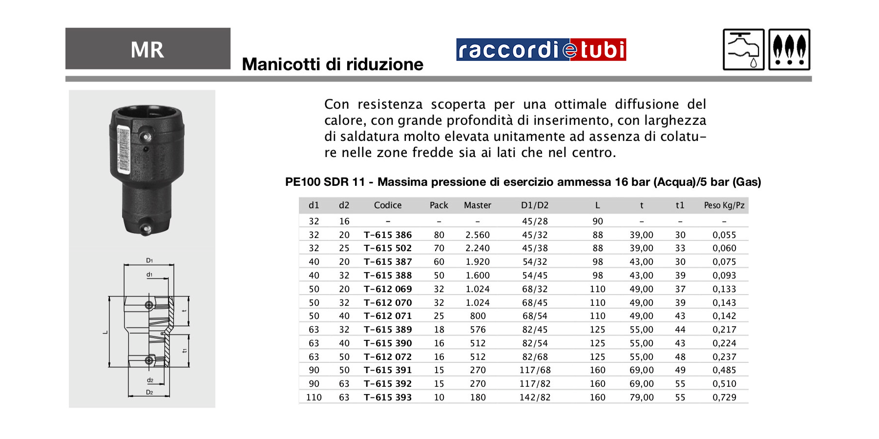 Manicotto ridotto alta pressione femmina femmina per elettrofusione PE100 SDR 11 - Massima pressione di esercizio ammessa 16 bar (Acqua)/5 bar (Gas)