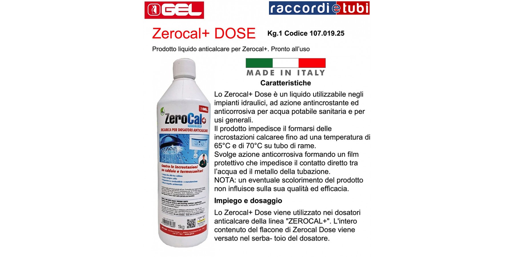 Caratteristiche Lo Zerocal Dose è un liquido utilizzabile negli impianti idraulici, ad azione antincrostante ed anticorrosiva per acqua potabile sanitaria e per usi generali. Il prodotto impedisce il formarsi delle incrostazioni calcaree fino ad una temperatura di 65°C e di 70°C su tubo di rame. Svolge azione anticorrosiva formando un film protettivo che impedisce il contatto diretto tra l’acqua ed il metallo della tubazione. NOTA: un eventuale scolorimento del prodotto non influisce sulla sua qualità ed efficacia. Impiego e dosaggio Lo Zerocal Dose viene utilizzato nei dosatori anticalcare della linea "ZEROCAL ". L'intero contenuto del flacone di Zerocal Dose viene versato nel serba- toio del dosatore. Stoccaggio Immagazzinare il prodotto in un locale asciutto e protetto dal gelo, rispettando le prescrizioni per l’immagazzinamento dei prodotti alimentari. Conservare fuori dalla portata dei bambini. Avvertenze Il prodotto deve essere utilizzato nei dosatori della linea ZEROCAL per garantire il rientro nei limiti di potabilità fissati dal DPR 236 del 24/05/88 Packaging Lo Zerocal Dose Codice Prodotto 107.019.40 Flacone da 1 Kg