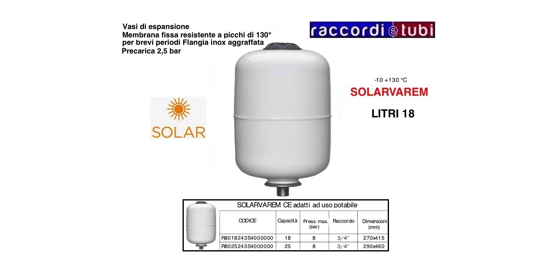 VASO DI ESPANSIONE VAREM CILINDRICO LT.18 PER USO SOLARE -10 130°C