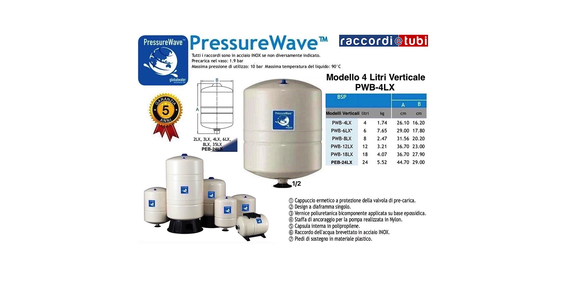 CARATTERISTICHE Design a diaframma singolo Certificato CE/PED, WRAS, ACS, ISO: 9001, Gost,Approvazione Evraz Raccordo idraulico brevettato e realizzato in acciaio INOX Rivestimento in polipropilene originale Vernice poliuretanica bicomponente applicata ad un fondo epossidico Non perde aria, parapolvere a tenuta ermetica a protezione della valvola di pre-carica Testato individualmente piú volte durante il processo produttivo. Non necessita di alcuna manutenzione.