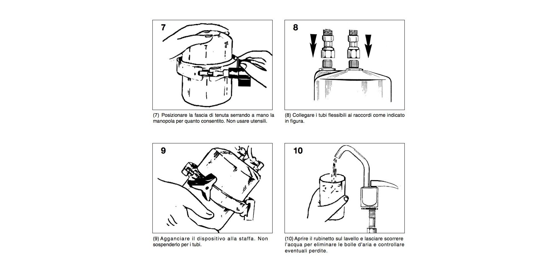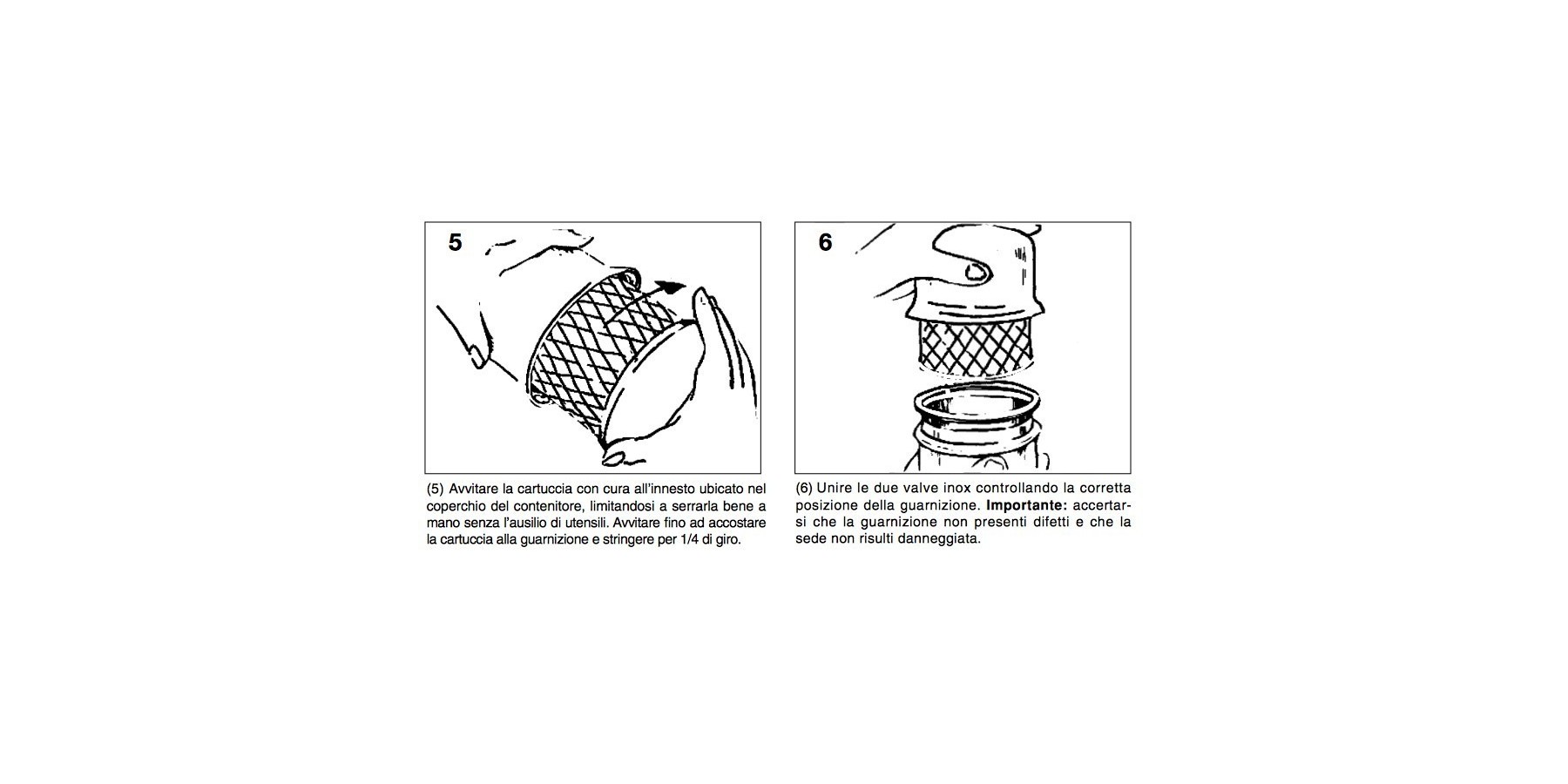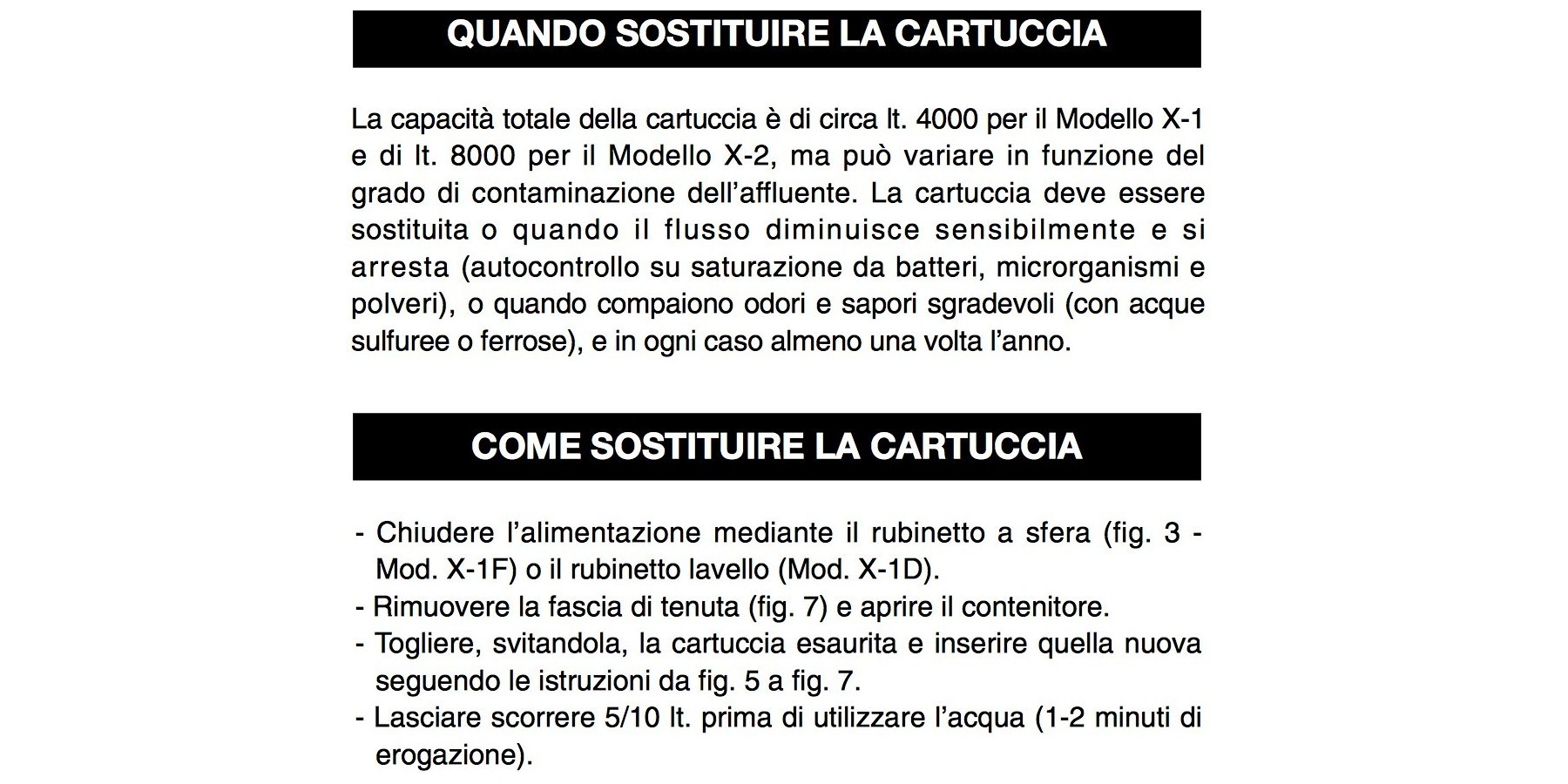 La sostituzione della cartuccia filtrante é molto facile e va effettuata quando il flusso d'acqua diminuisce (saturazione da microrganismi o particelle) o quando viene raggiunta la capacità indicata.Fasi del processo di purificazione