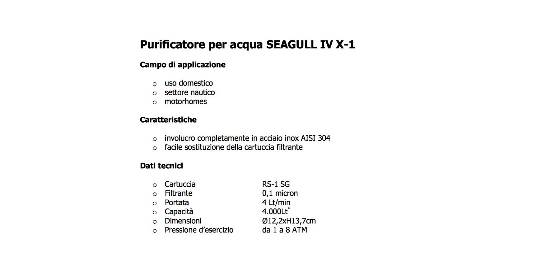 Il modello X-1 é il più usato e diffuso della linea SEAGULL ® IV. Studiato specificamente per l'uso domestico, dove trova la maggiore applicazione, é usato con successo nel settore nautico e dei motorhomes, grazie alle sue dimensioni ridotte.