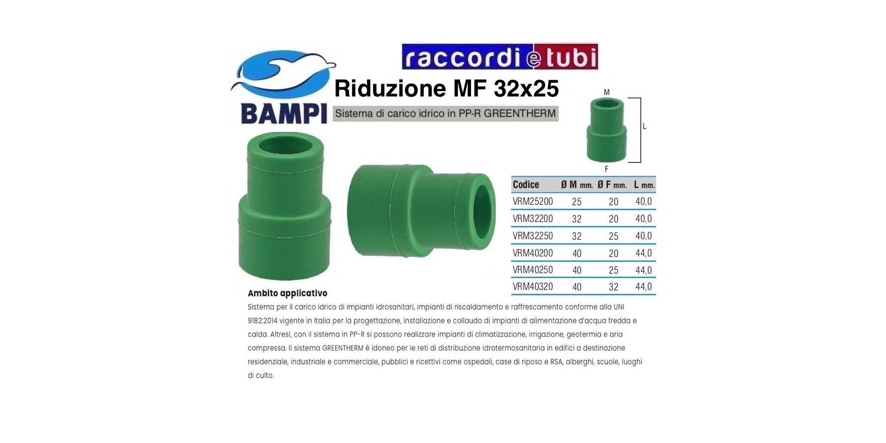 Utilizzato da 25 anni nella distribuzione di acqua calda e fredda, il sistema in polipropilene random GREENTHERM offre caratteristiche fisiche meccaniche di assoluta affidabilità. La gamma GREENTHERM di Bampi offre diametri da 20, 25, 32, 40, 50, 63, 75, 90 e 110 mm. con 4 differenti tipologie di tubazioni compatibili con un’unica gamma di raccordi a saldare: