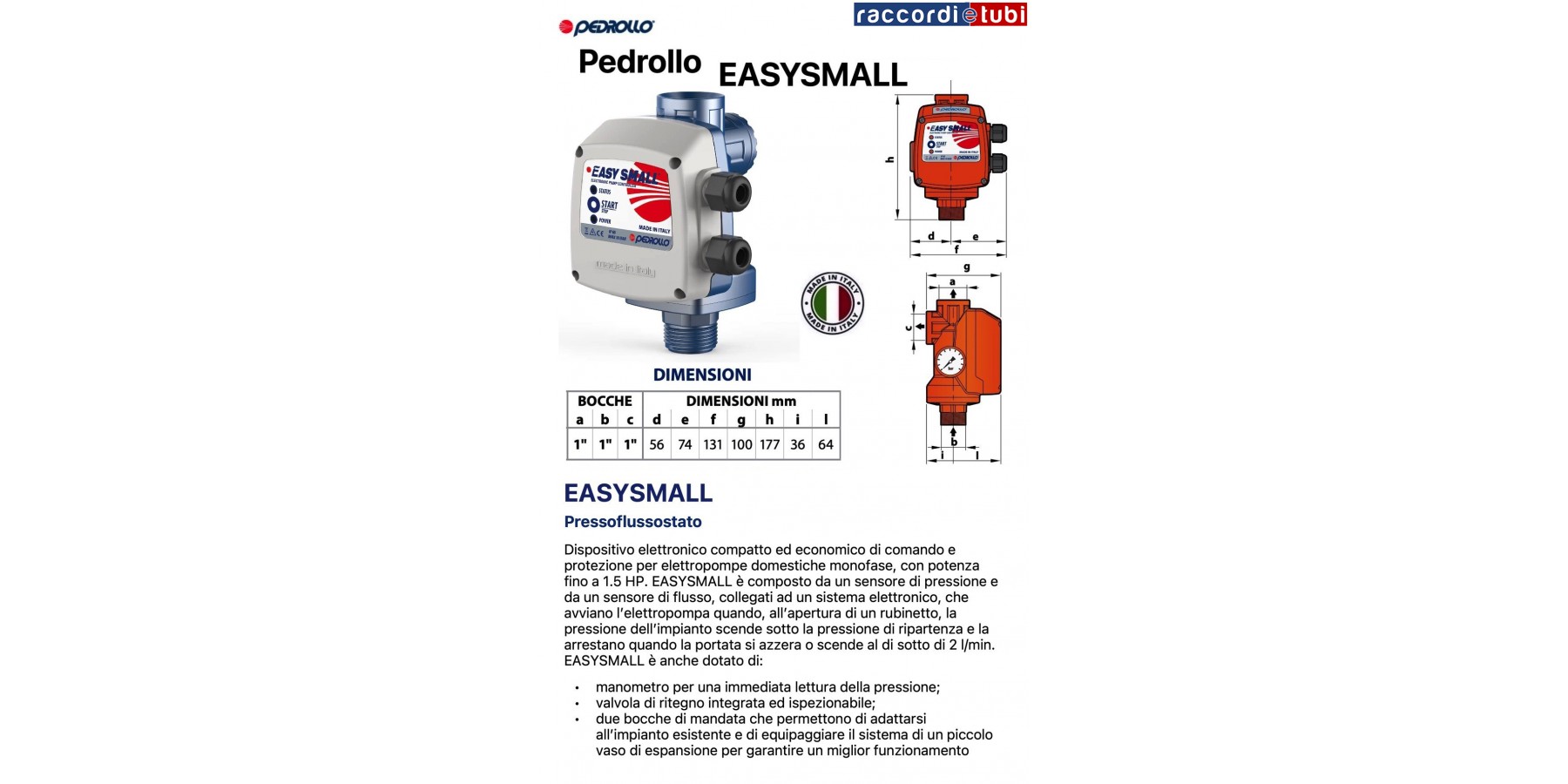 Pressoflussostato per il controllo e la protezione di pompe monofase fino a 1,5 HP per usi domestici. Il pressoflussostato avvia l’elettropompa su cui è installato a seguito di una calo della pressione dell’impianto (es. apertura di un rubinetto) e la arresta quando il flusso scende sotto i 2 litri al minuto.
